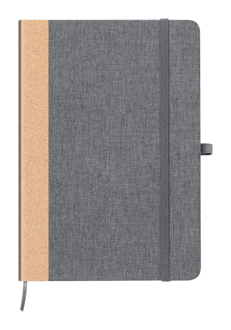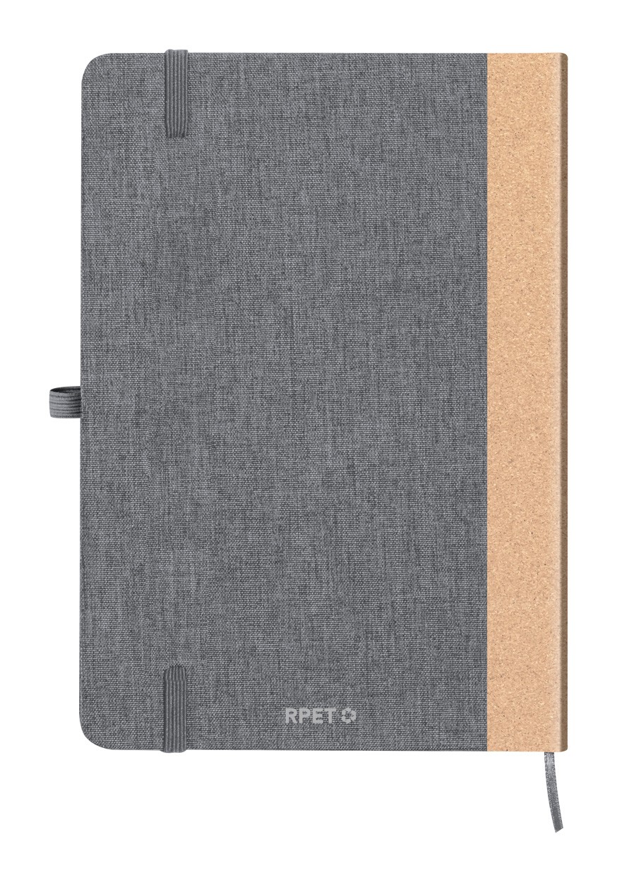 Agendă cu copertă din poliester 300D RPET, cu cotor din plută naturală, 80 de foi veline, semn de carte, bandă de cauciuc și suport pentru pix.