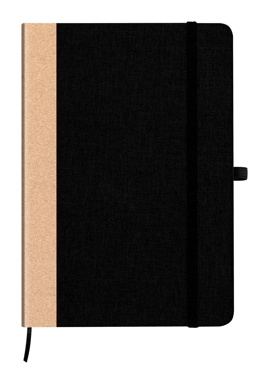 Agendă cu copertă din poliester 300D RPET, cu cotor din plută naturală, 80 de foi veline, semn de carte, bandă de cauciuc și suport pentru pix.