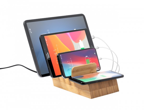 Stație de încărcare USB Bamboo cu suporturi mobile și încărcător rapid fără fir încorporat (10W). Cu 2 porturi USB și 1 USB-C pentru încărcător. Inclusiv cablu de încărcare AC.
