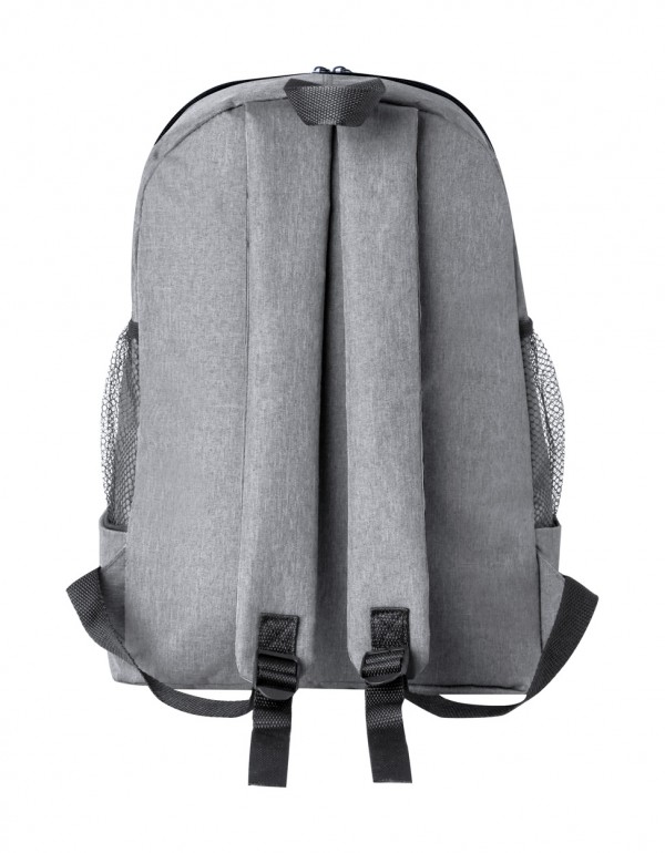 Rucsac RPET, cu compartiment cu fermoar și buzunar frontal, buzunare laterale din plasă, spate și bretele căptușite. Poliester 300D RPET cu etichetă RPET distinctă.
