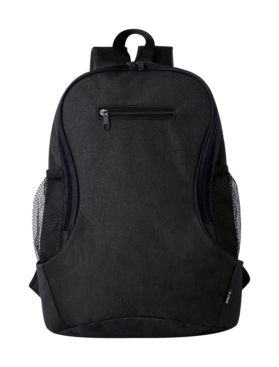 Rucsac RPET, cu compartiment cu fermoar și buzunar frontal, buzunare laterale din plasă, spate și bretele căptușite. Poliester 300D RPET cu etichetă RPET distinctă.
