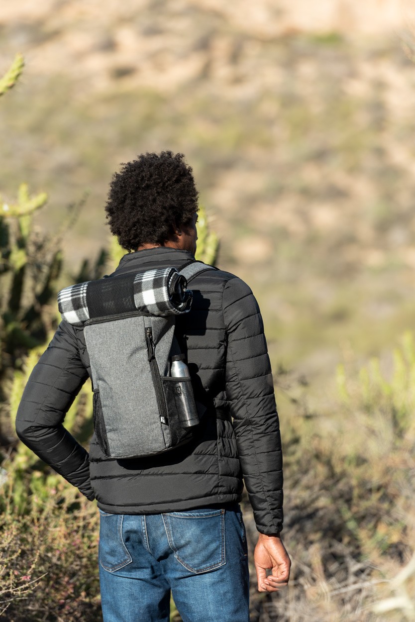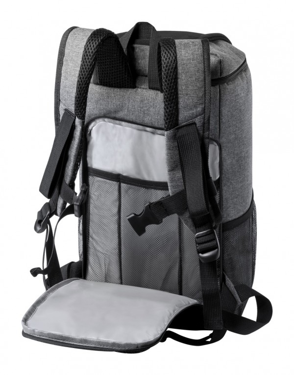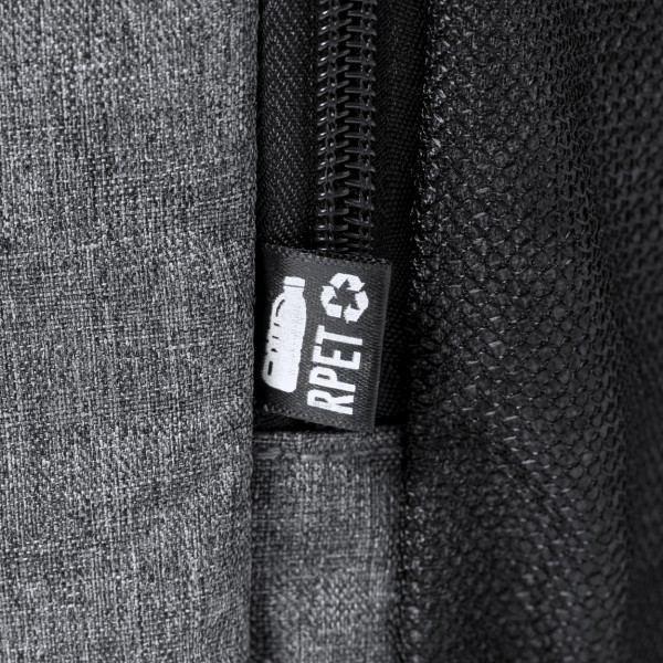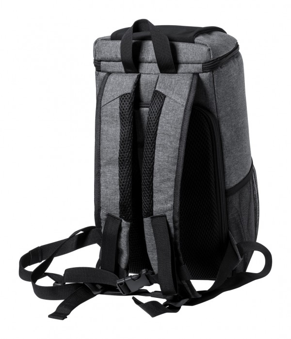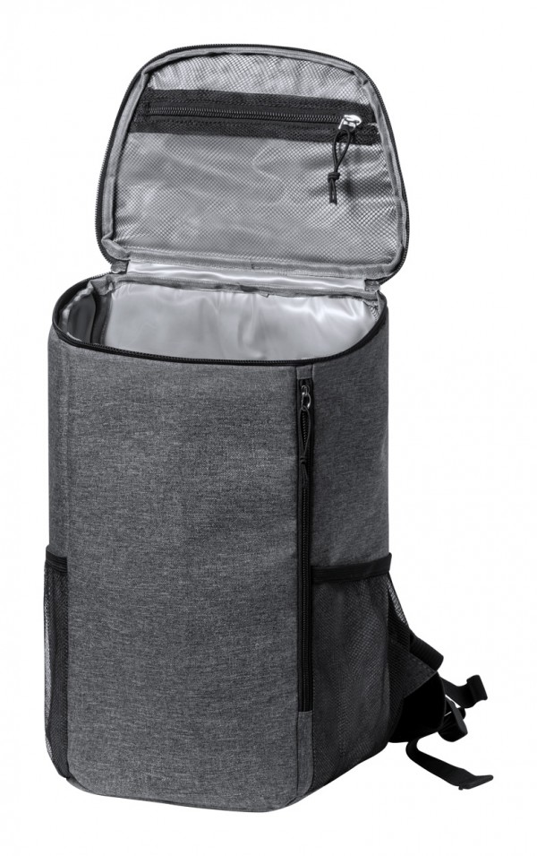 Rucsac termic, RPET, cu buzunar principal cu fermoar, cu căptușeală PEVA, buzunare laterale din plasă și bretele căptușite. Cu etichetă distinctivă RPET. Poliester 600D RPET.