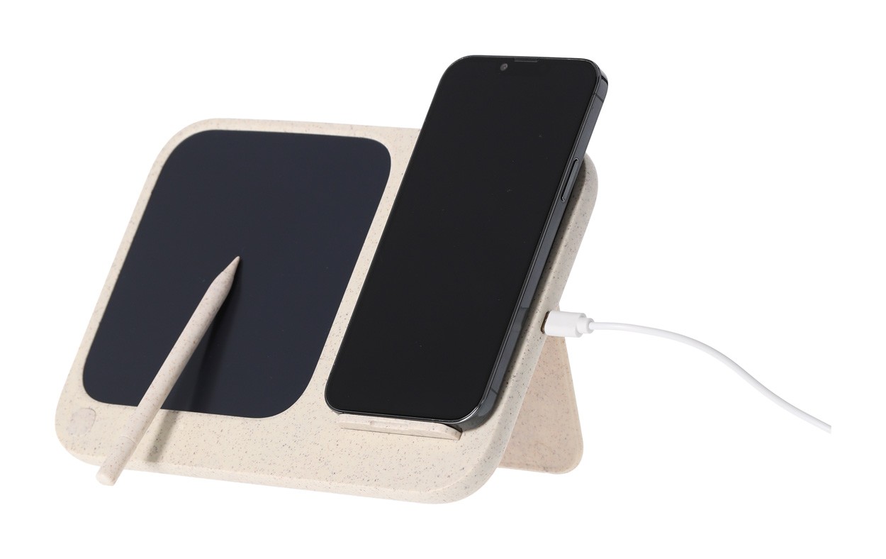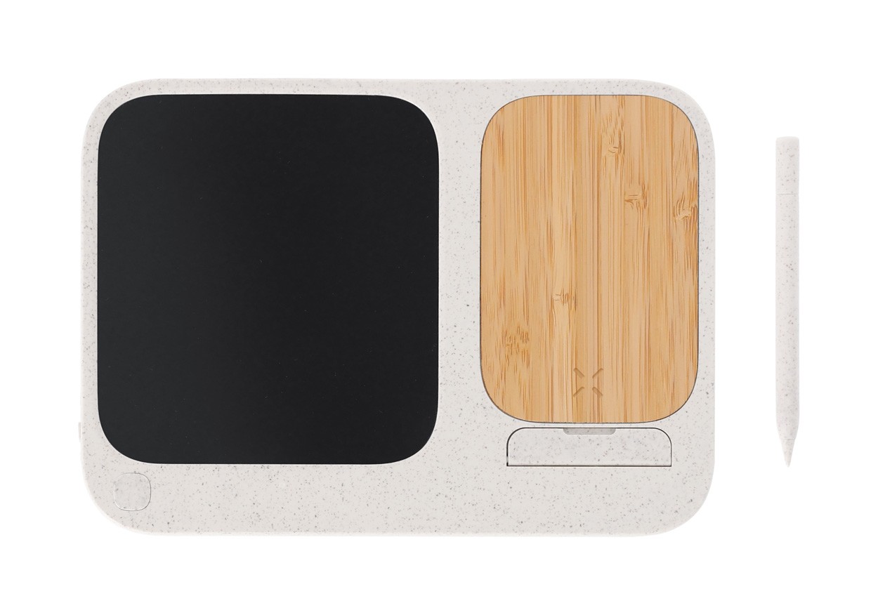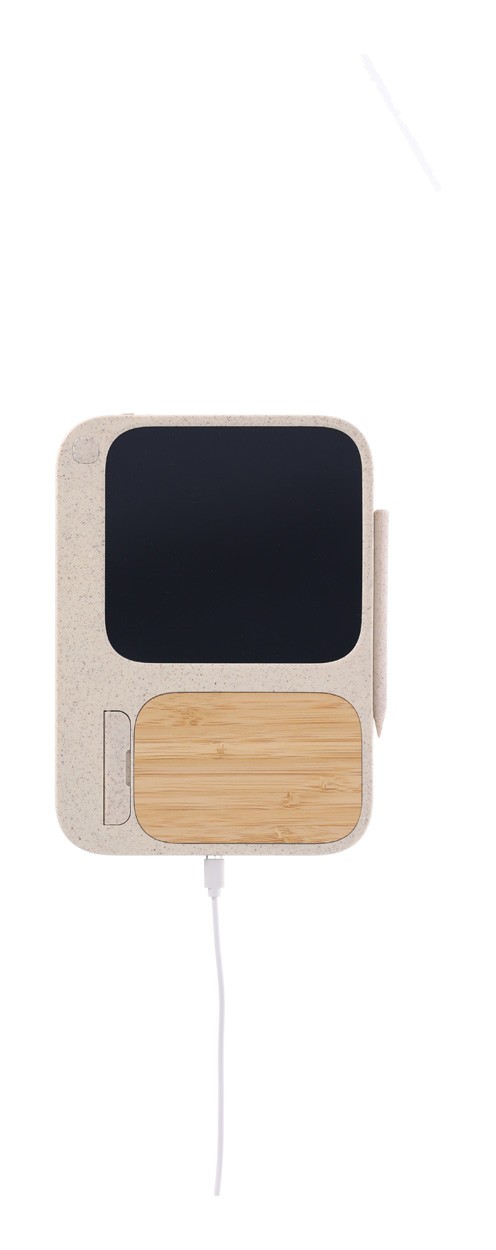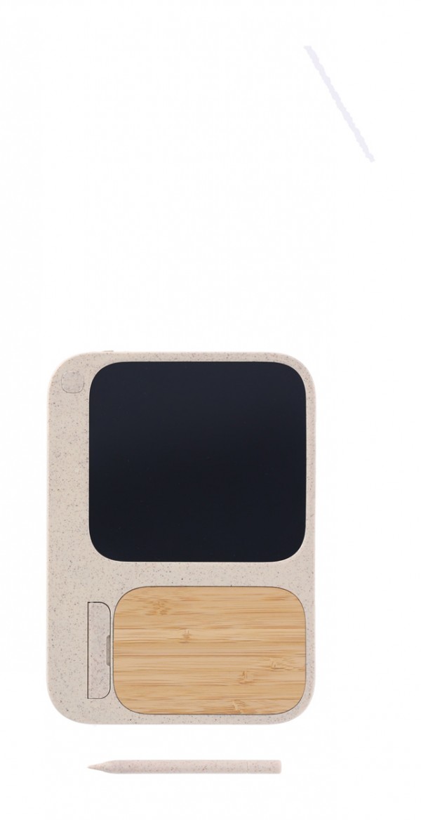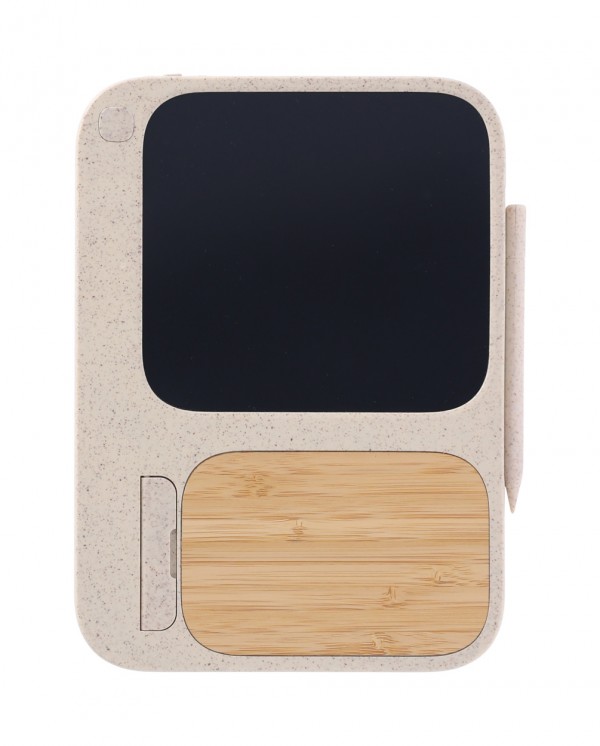 Încărcător fără fir, din plastic din paie de grâu și bambus (15W) cu tabletă de scris LCD integrată (6") și stilou. Cu funcție de suport mobil. Include baterie tip buton și cablu de încărcare USB.