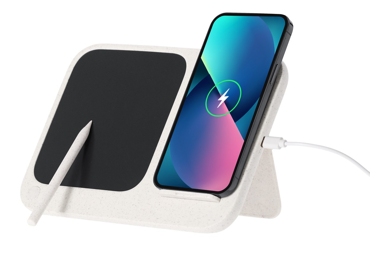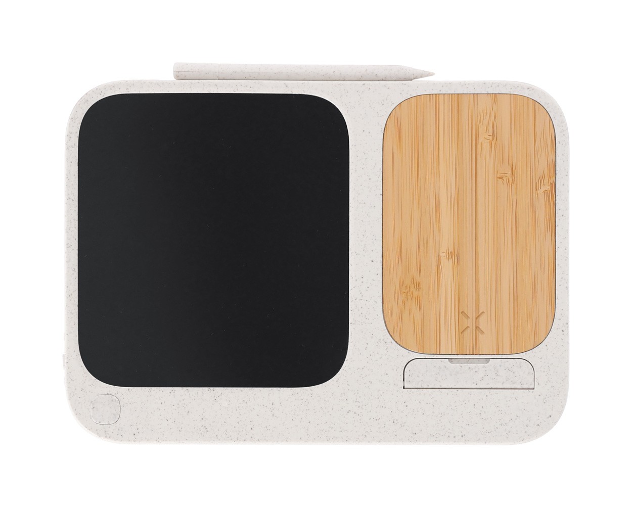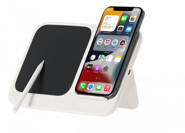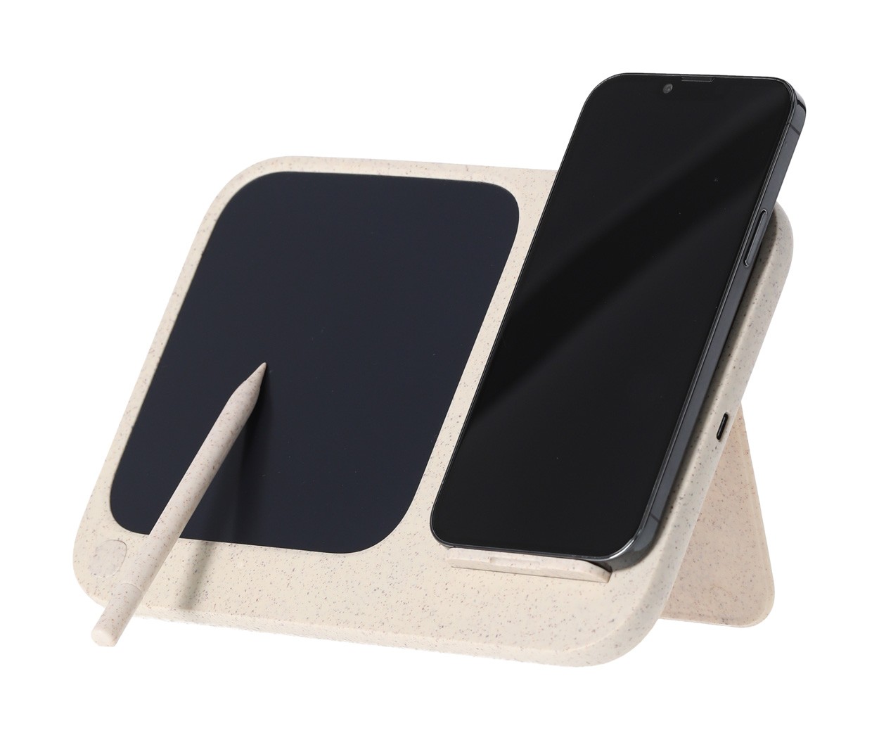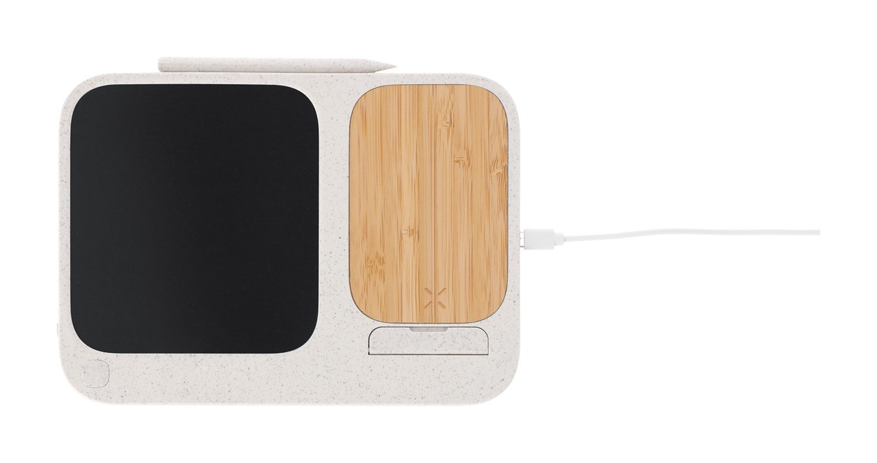 Încărcător fără fir, din plastic din paie de grâu și bambus (15W) cu tabletă de scris LCD integrată (6") și stilou. Cu funcție de suport mobil. Include baterie tip buton și cablu de încărcare USB.