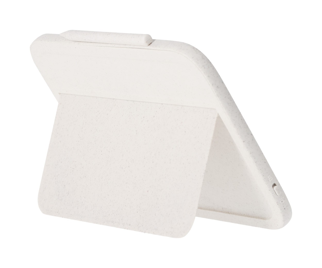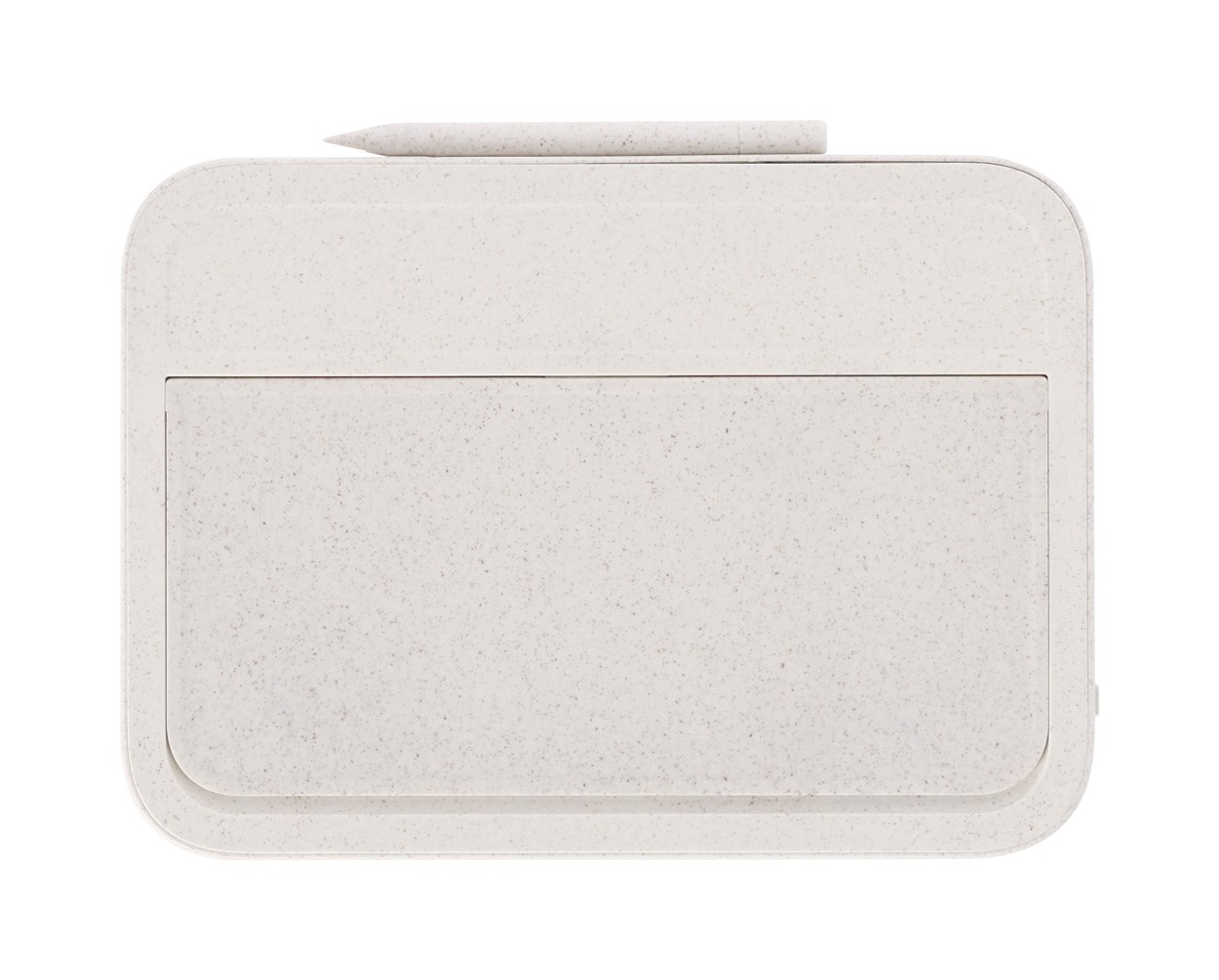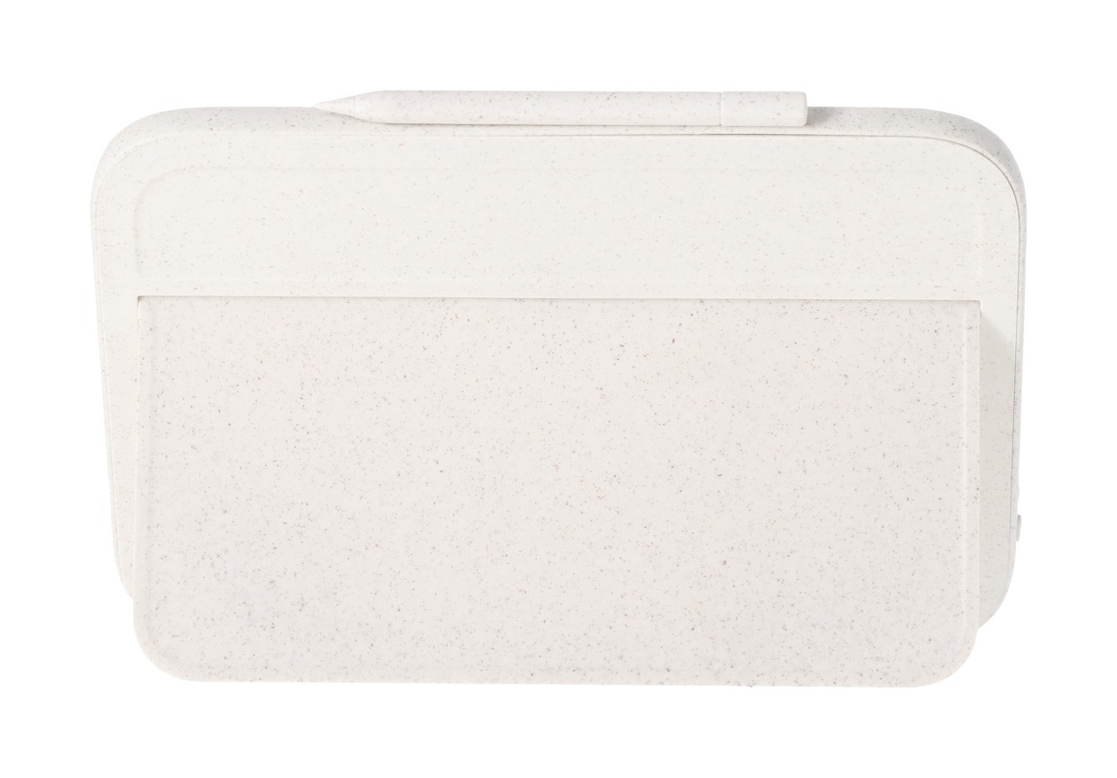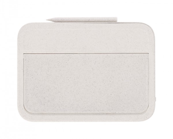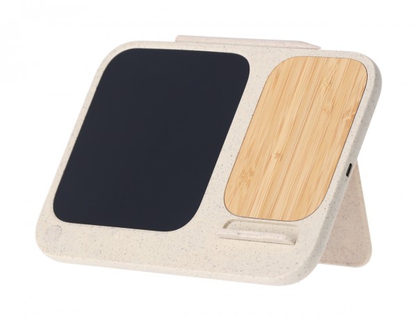 Încărcător fără fir, din plastic din paie de grâu și bambus (15W) cu tabletă de scris LCD integrată (6") și stilou. Cu funcție de suport mobil. Include baterie tip buton și cablu de încărcare USB.
