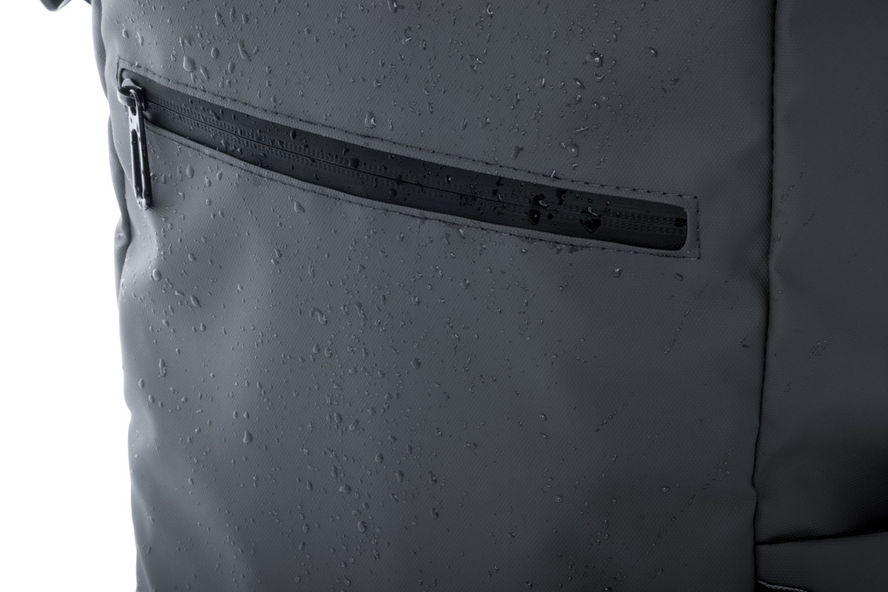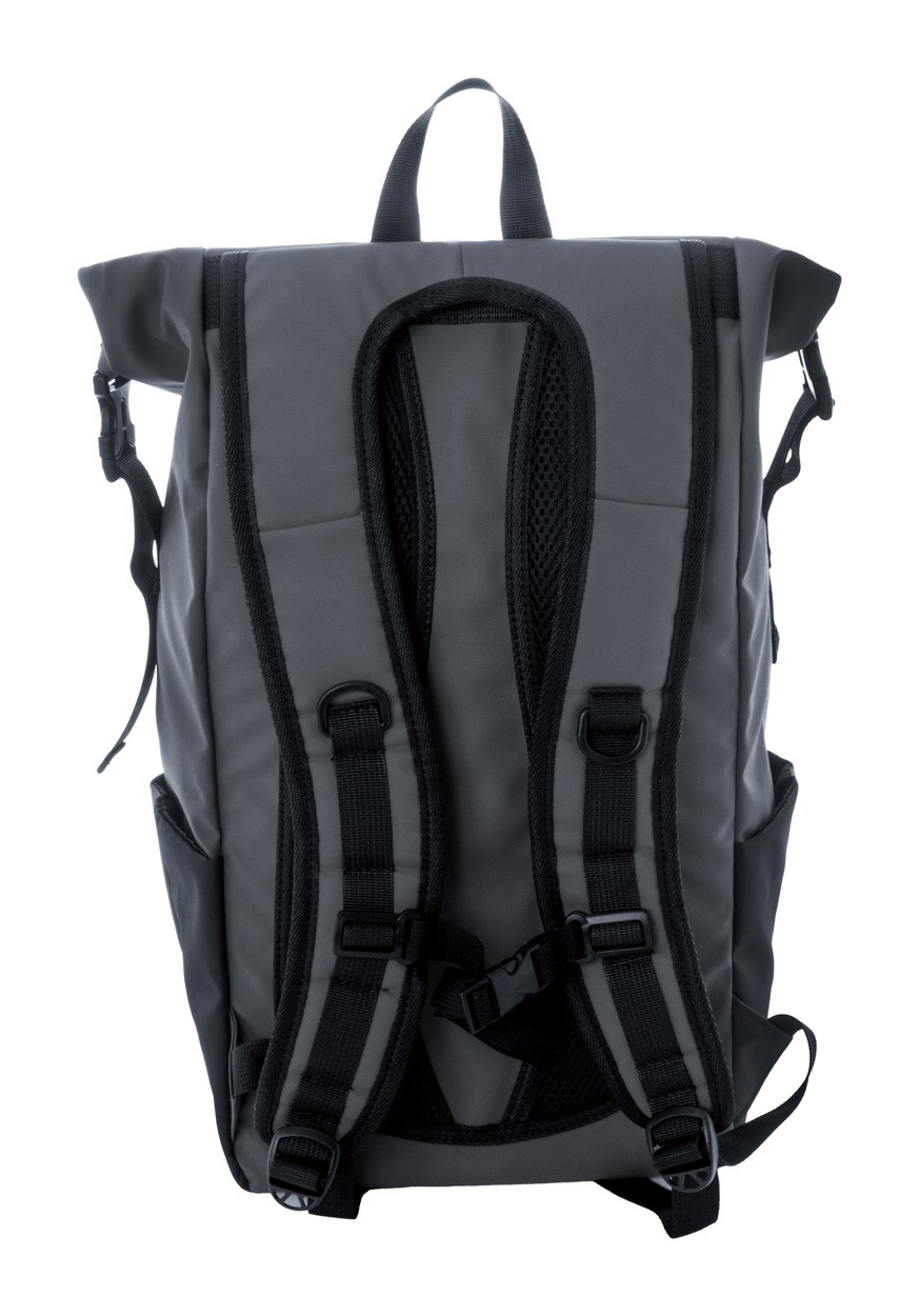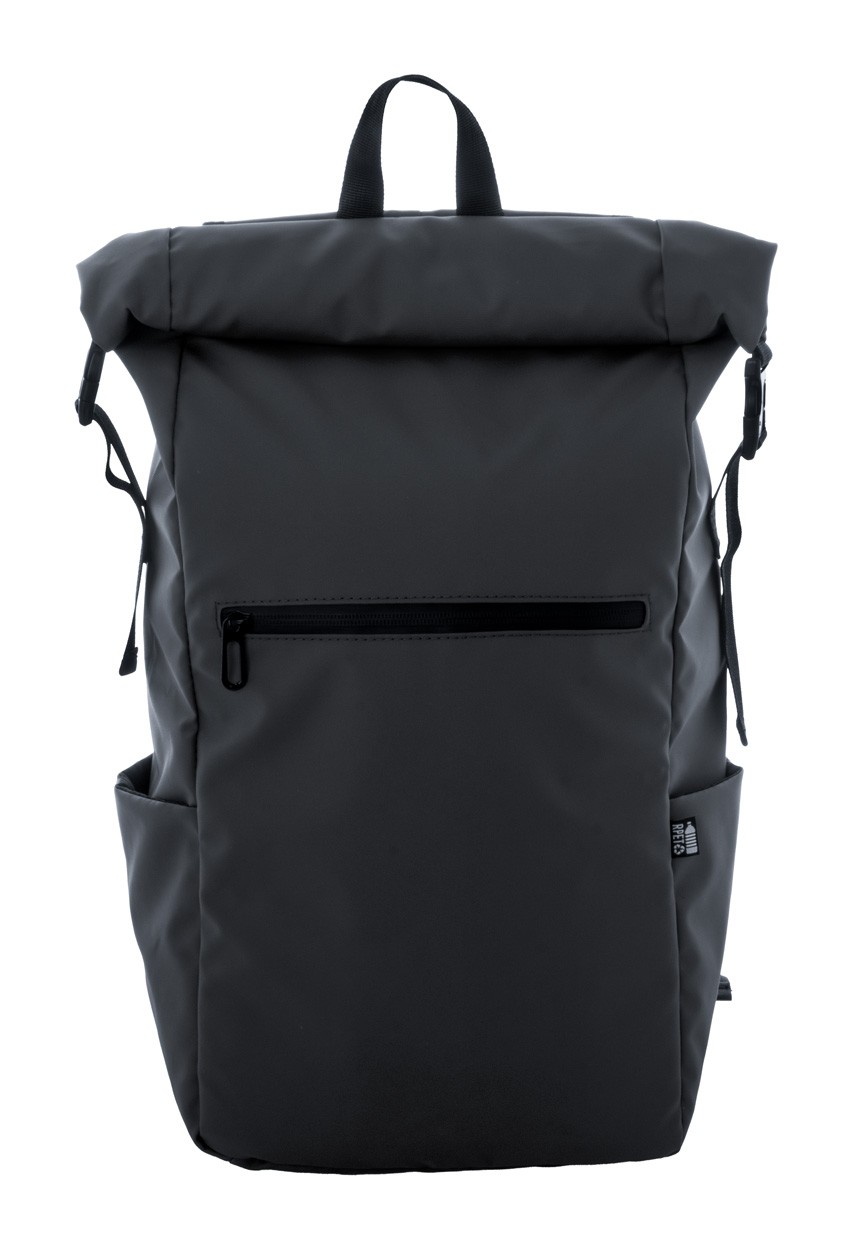 Rucsac rolltop, impermeabil, din RPET, cu cataramă și închidere cu velcro, compartiment căptușit pentru laptop (16") și tabletă (10"), buzunar frontal cu fermoar, buzunare laterale, spate și bretele căptușite. Poliester 600D RPET acoperit cu PU, cu etichetă RPET distinctă.