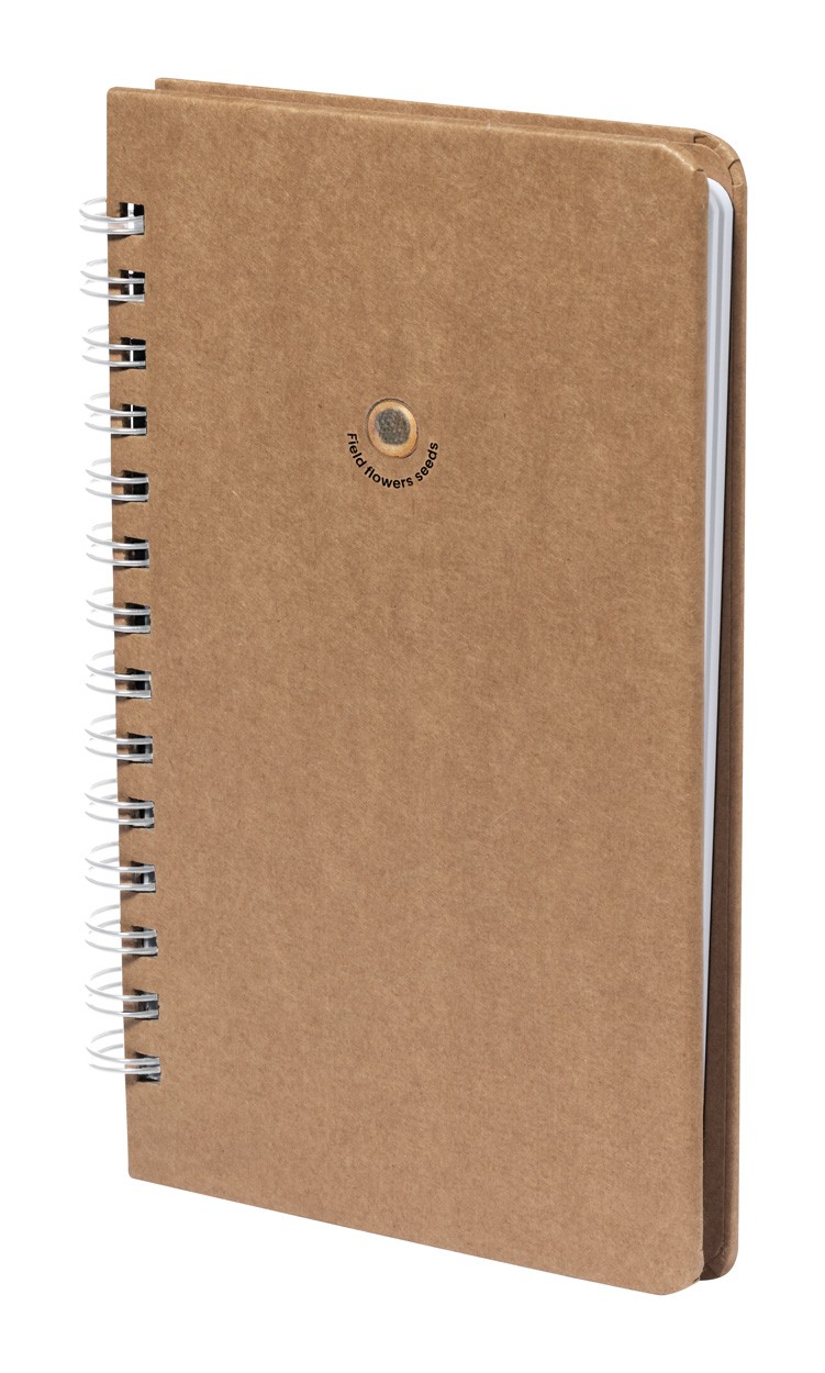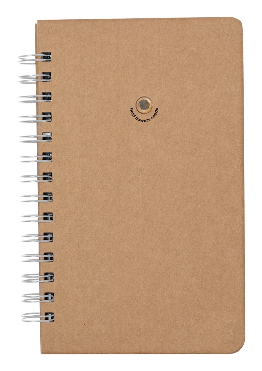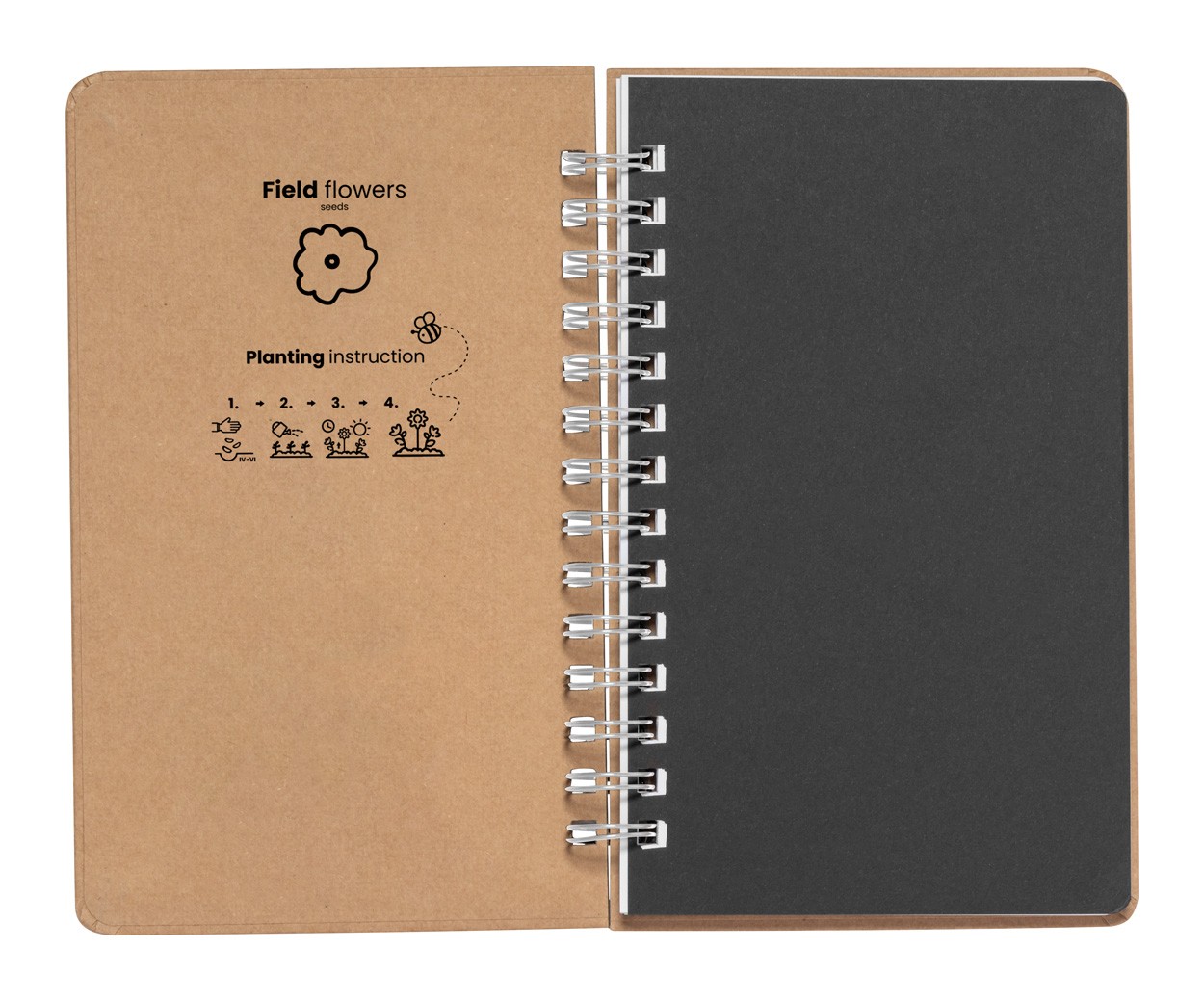 Recycled cardboard covered spiral notebook with 80 lined sheets in recycled paper. Including plantable wildflower seeds.