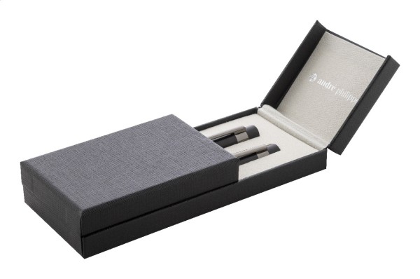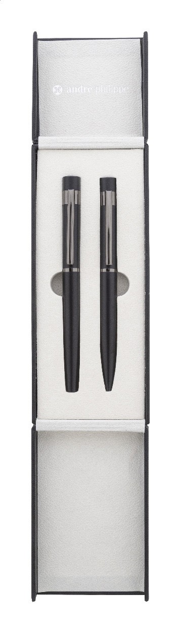 Set elegant de pix și roller, din metal, cu detalii metalice strălucitoare. În cutie cadou de culoare asortată, cu mină albastră. Produs marca André Philippe.