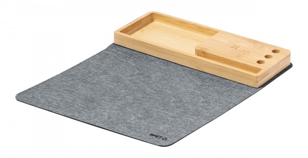 Mousepad pliabil, din poliester RPET, cu bază din silicon. Cu încărcător rapid fără fir încorporat (15W) și suport din bambus pentru telefon mobil. Poliester 300D RPET. Inclusiv cablu de încărcare USB.