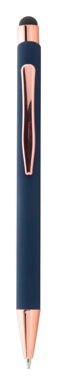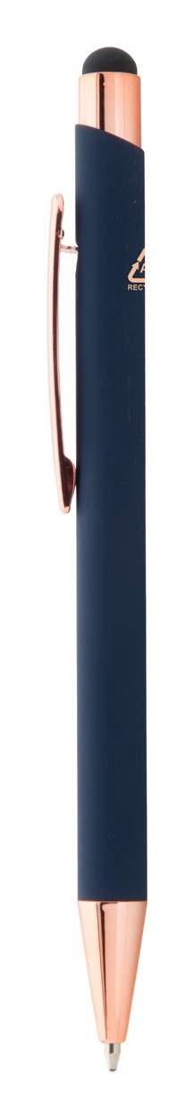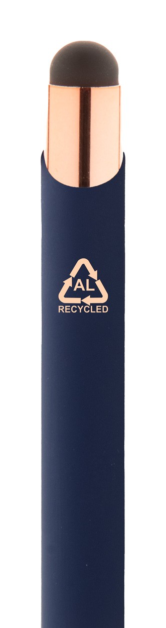 Pix cu capăt pentru ecran tactil, din aluminiu reciclat, cu finisaj cauciucat și detalii auriu roz. Cu acoperire specială pentru gravarea laser în oglindă în culoarea aur roz. Cu mină albastră