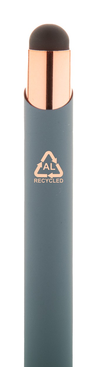 Pix cu capăt pentru ecran tactil, din aluminiu reciclat, cu finisaj cauciucat și detalii auriu roz. Cu acoperire specială pentru gravarea laser în oglindă în culoarea aur roz. Cu mină albastră