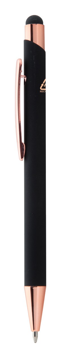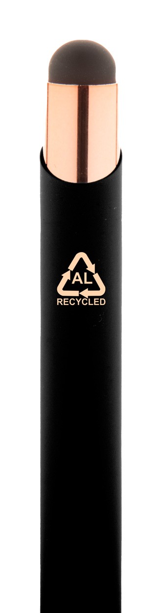 Pix cu capăt pentru ecran tactil, din aluminiu reciclat, cu finisaj cauciucat și detalii auriu roz. Cu acoperire specială pentru gravarea laser în oglindă în culoarea aur roz. Cu mină albastră