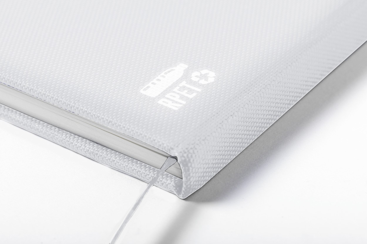 Agendă cu copertă din RPET poliester, cu semn de carte și bandă de cauciuc. Cu 80 de pagini cu liniatură dictando. Dimensiune A5.