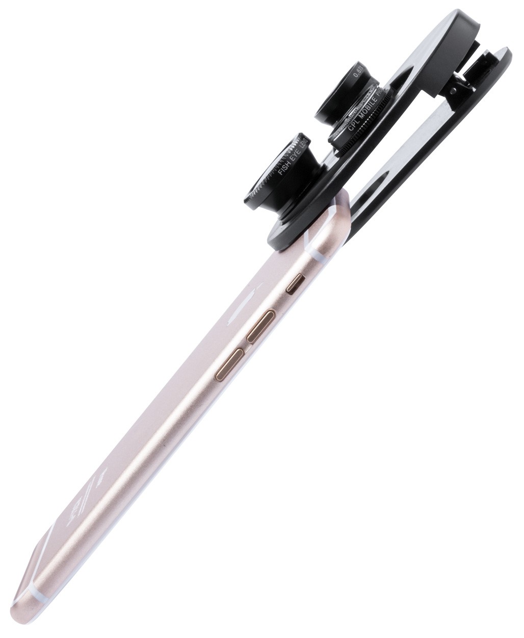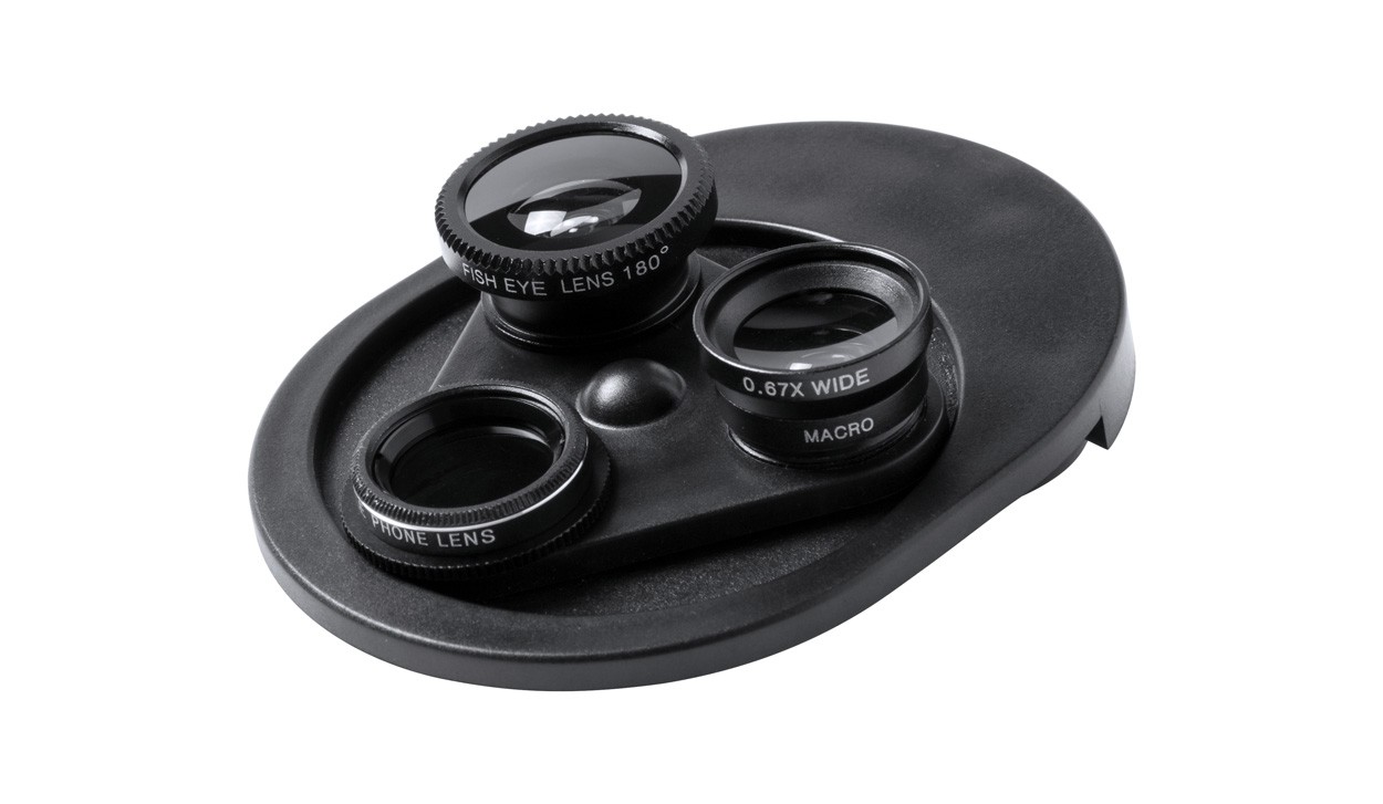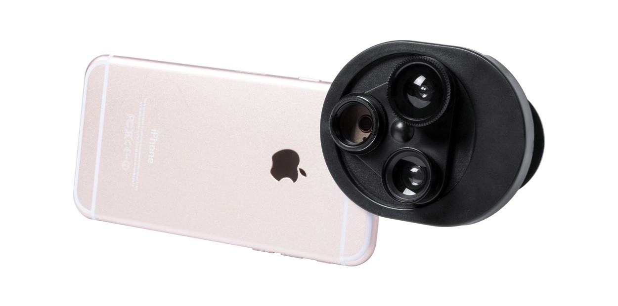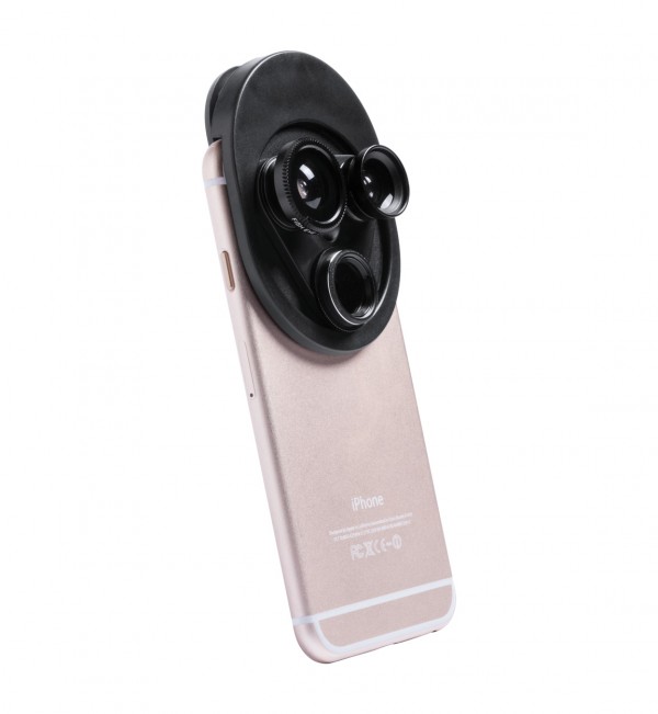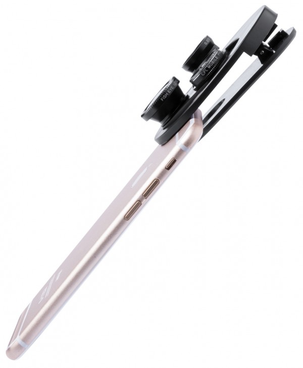 Obiectiv universal pentru smartphone cu 3 lentile rotative. 4 funcții: fish-eye, macro, unghi larg, polarizare circulară.