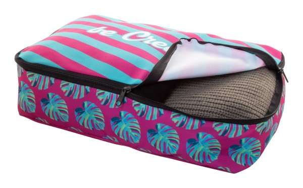 Organizator pentru bagaje, realizat la comandă, cu fermoar, din poliester 600D RPET. Cu grafică imprimată prin sublimare și etichetă RPET distinctivă. MOQ: 25 buc.