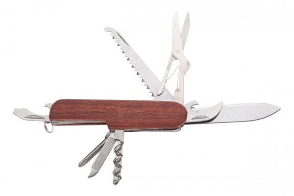 Briceag din oțel inoxidabil cu mâner din lemn, cu 9 funcții.