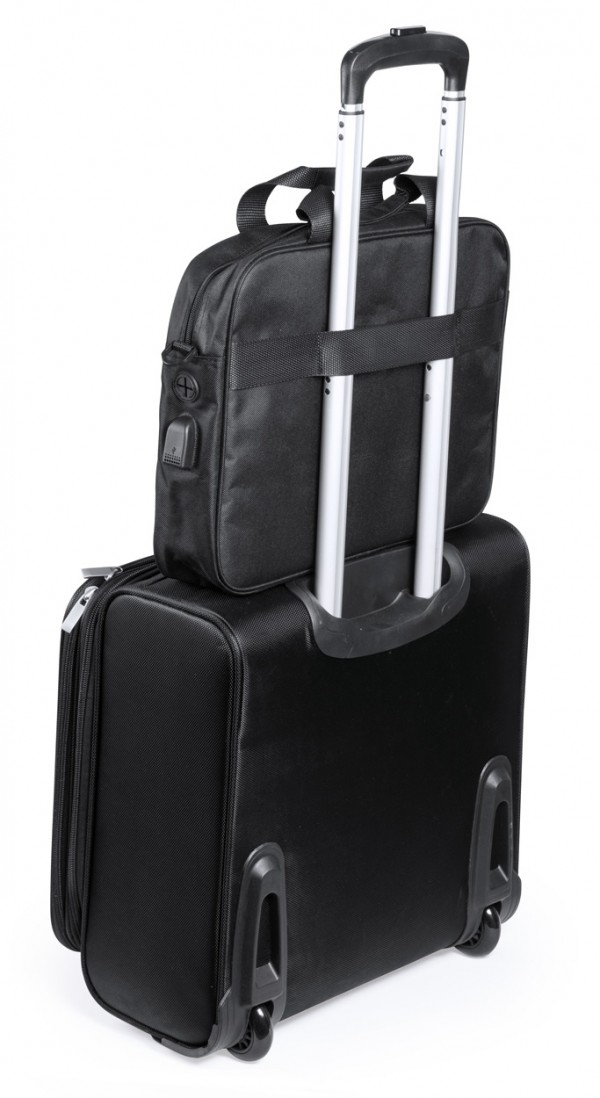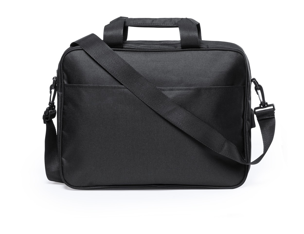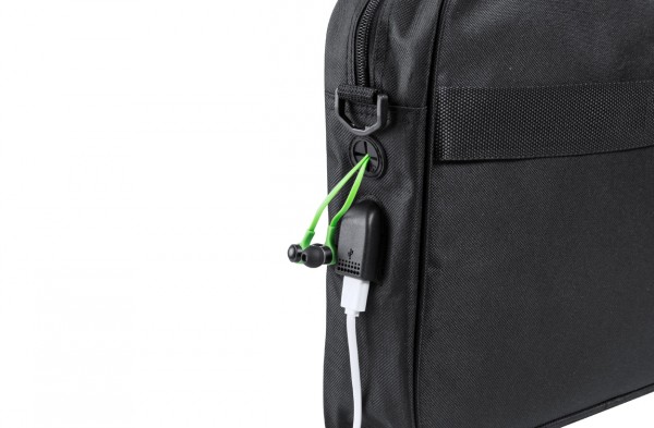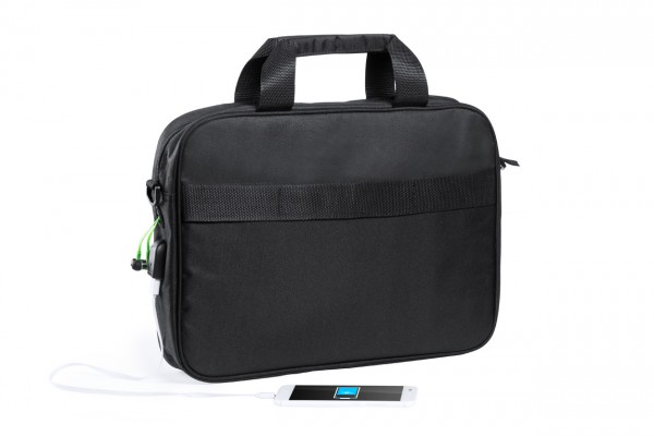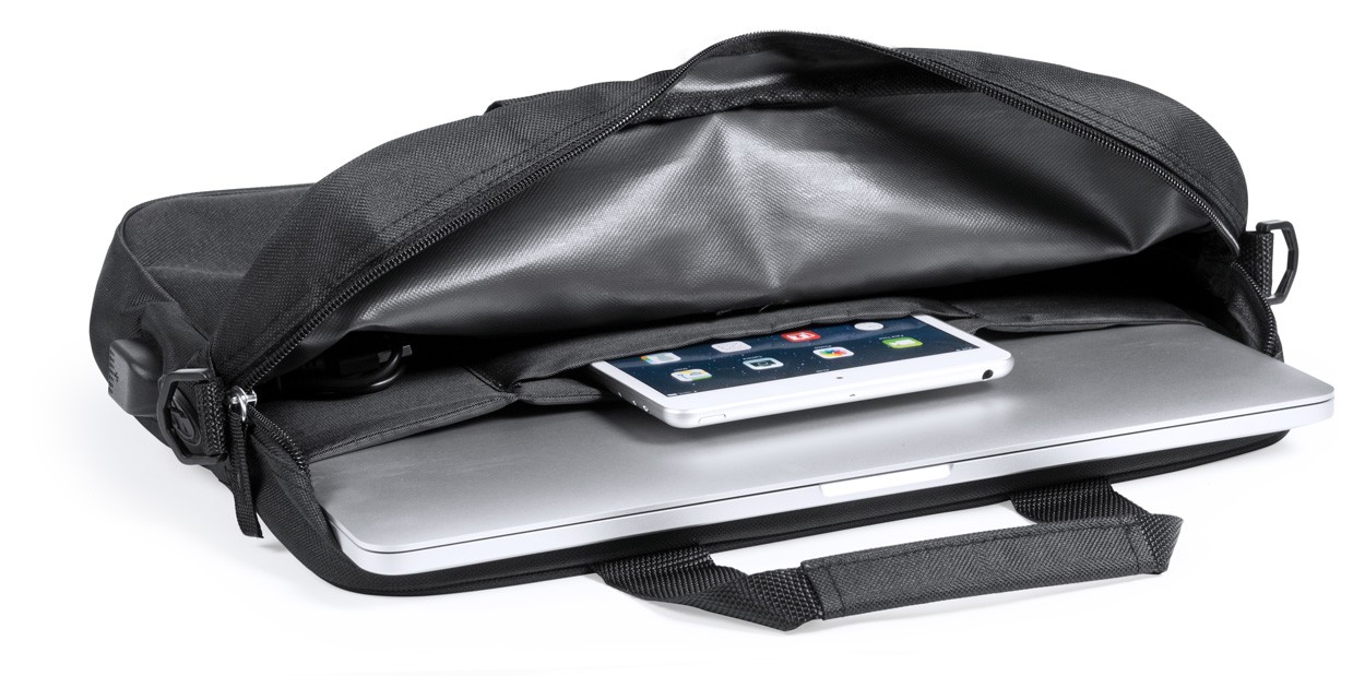 Geantă pentru documente cu fermoar, curea reglabilă pentru umăr, compartiment pentru laptop și pentru tabletă. Mufă pentru căști și conexiune USB încorporată pentru power bank.Poliester 600D.