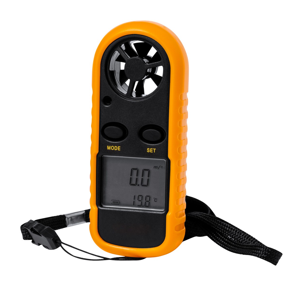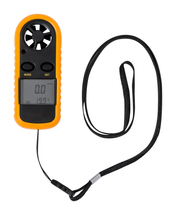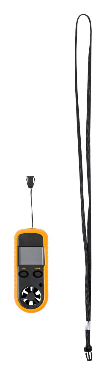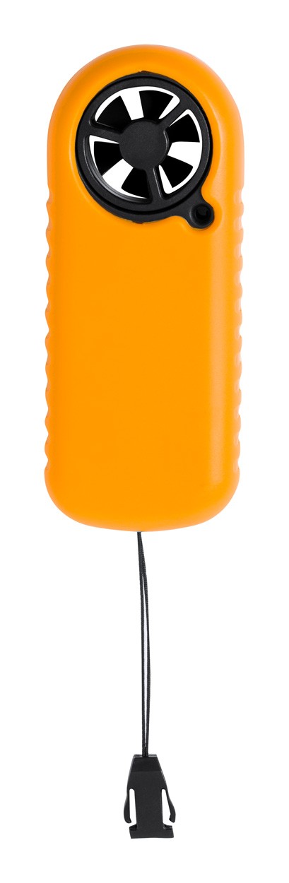 ABS plastic anemometer with LCD display and multiple functions. With neck strap, including button cell battery.