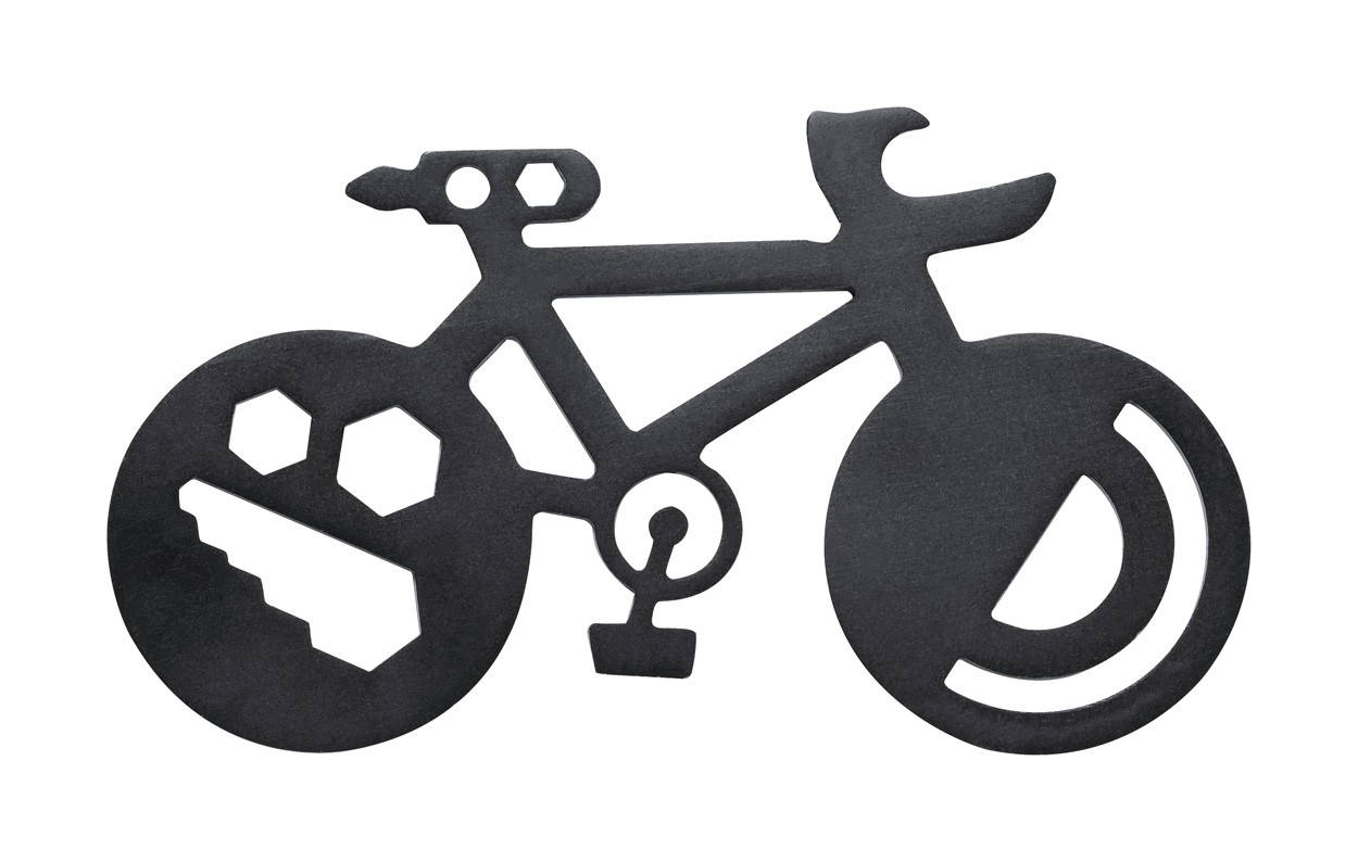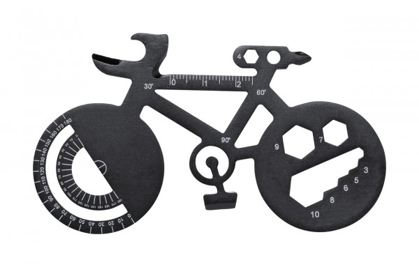 Bicycle shaped, stainless steel multitool with 16 functions.