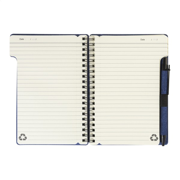 Caiet cu spirală, din hârtie reciclată, cu 80 de file dictando. Format A6. Include hârtie reciclată și pix din PP reciclat cu mină albastră.