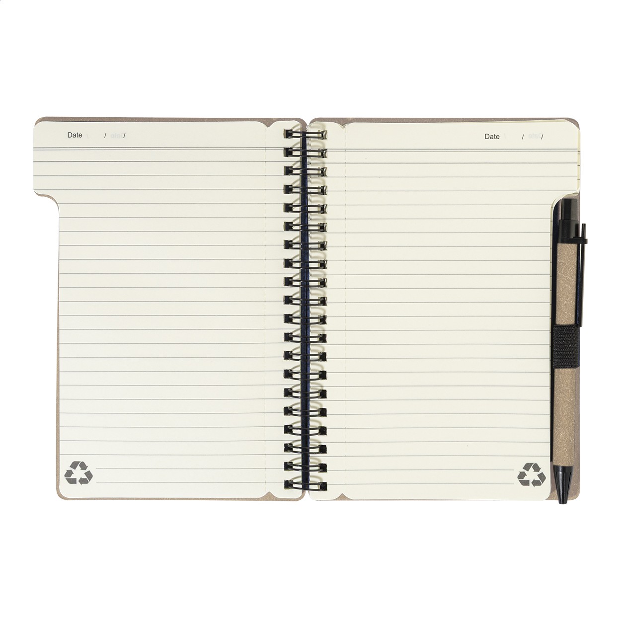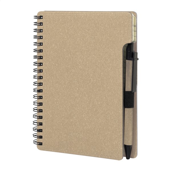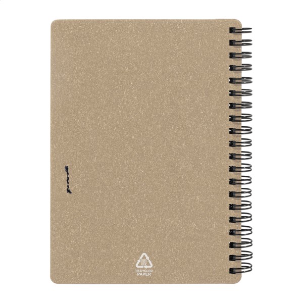 Caiet cu spirală, din hârtie reciclată, cu 80 de file dictando. Format A6. Include hârtie reciclată și pix din PP reciclat cu mină albastră.