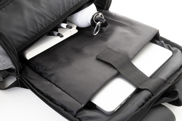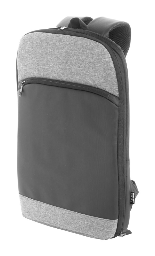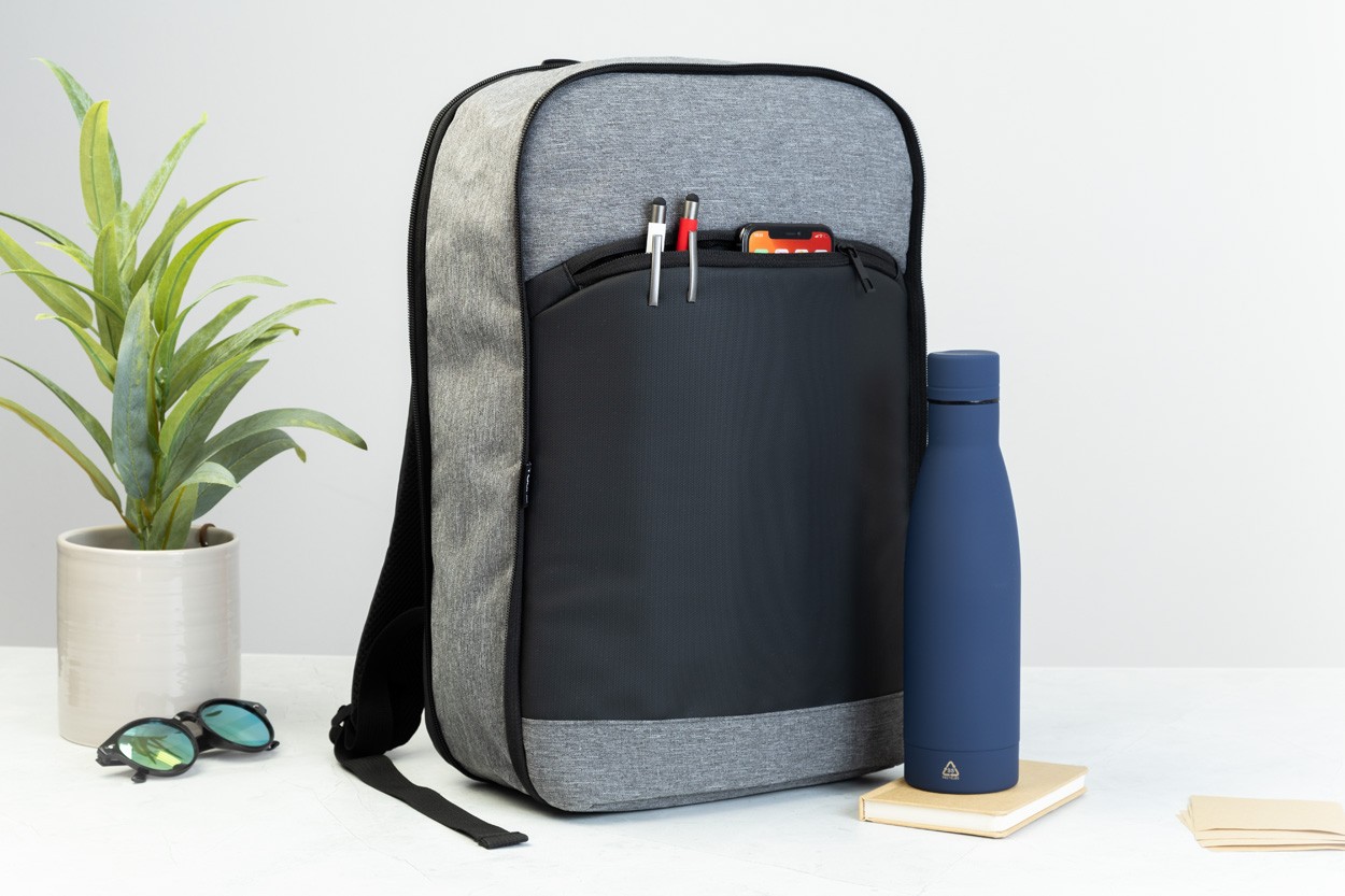 Rucsac extensibil, RPET, cu compartiment principal cu fermoar, buzunar frontal cu fermoar, compartiment căptușit pentru laptop (15") și partea din față acoperită cu PU. Cu cureaua pentru cărucior, spate și curele de umăr căptușite. Poliester 600D RPET, cu etichetă RPET distinctă.