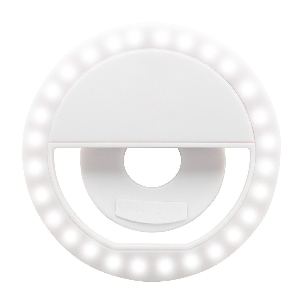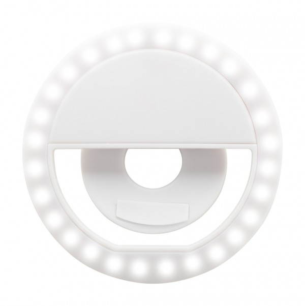 Inel din plastic pentru selfie cu 28 de LED-uri pentru telefoane mobile. Cu 3 niveluri de luminozitate reglabile și baterie reîncărcabilă încorporată. Inclusiv cablu încărcător USB.