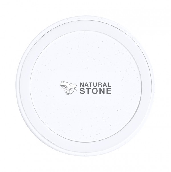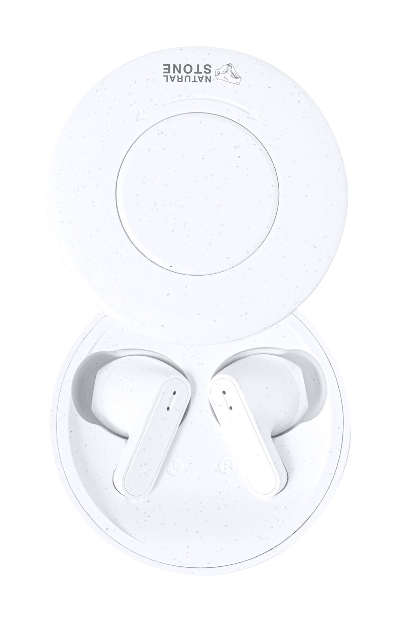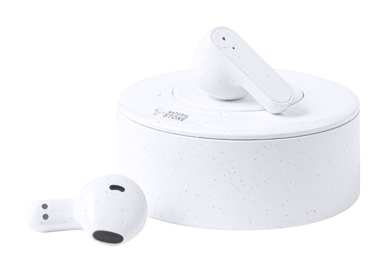 Bluetooth earphones in natural stone extract and ABS plastic, with hands-free call function. Including USB charger cable.