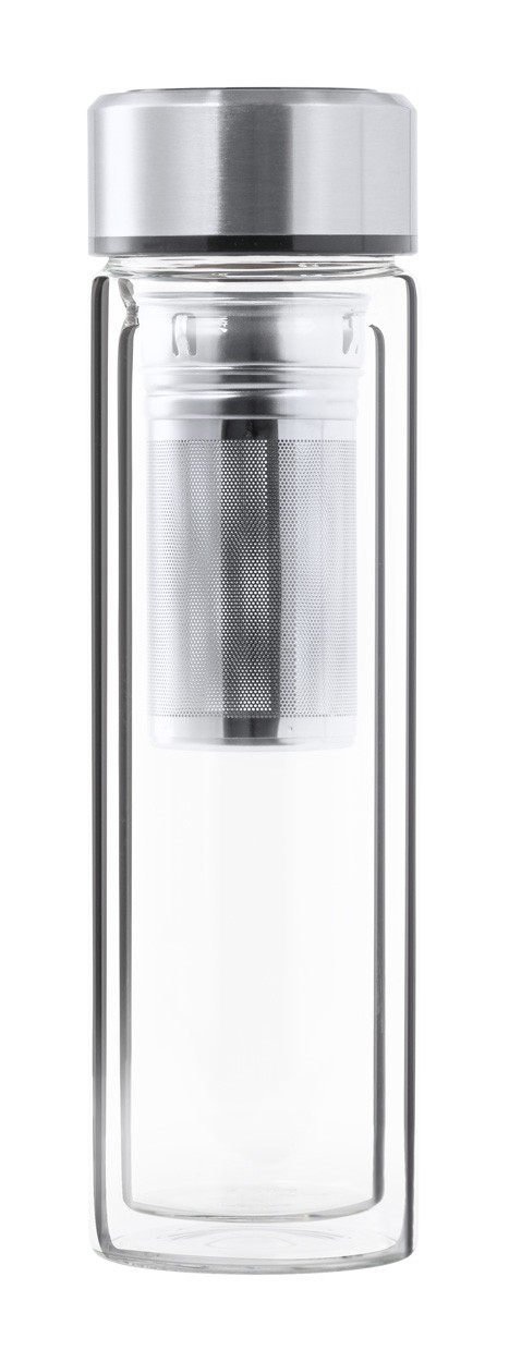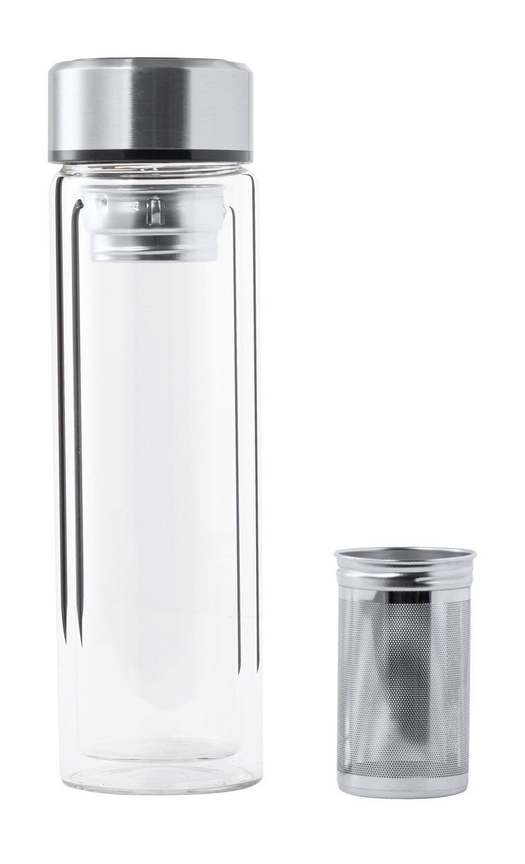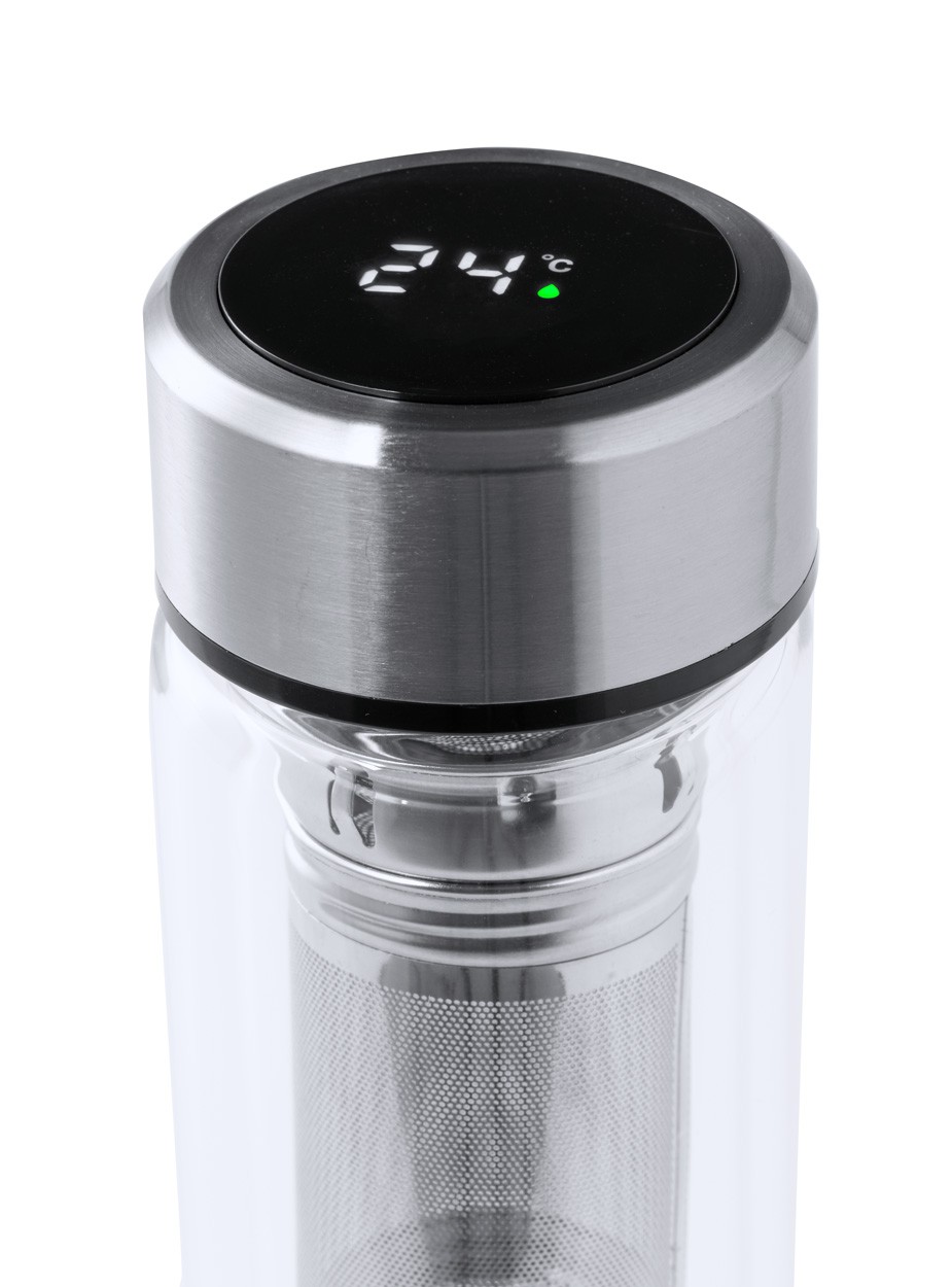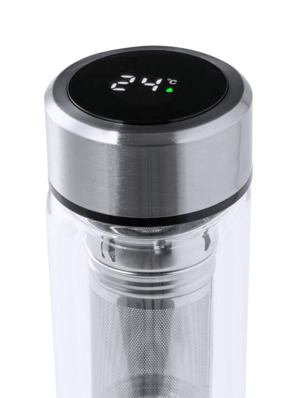 Sticlă termo, din sticlă borosilicată, cu perete dublu, cu infuzor de ceai și capac din oțel inoxidabil cu afișaj termometru tactil. 390 ml. Cu baterie tip buton. Nu este potrivit pentru băuturi carbogazoase.