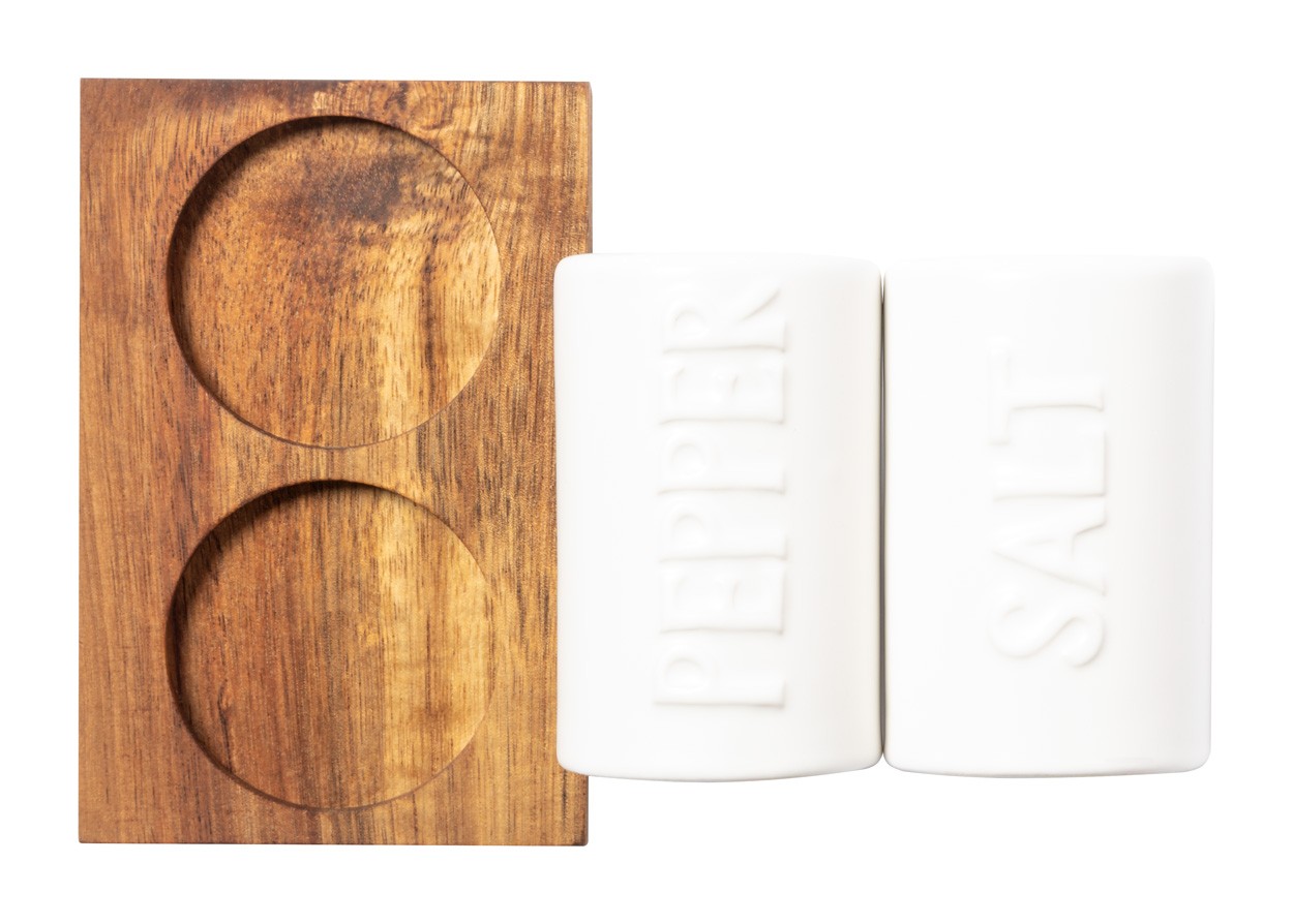 Set 2 bucăți solniță sare și piper, din ceramică, cu suport din lemn.