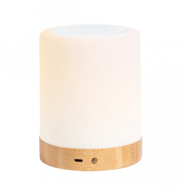 Difuzor Bluetooth din bambus și carcasă din plastic cu lumină LED multicoloră reglabilă. Cu funcție de apel hands-free și baterie reîncărcabilă încorporată. Inclusiv cablu de încărcare USB.