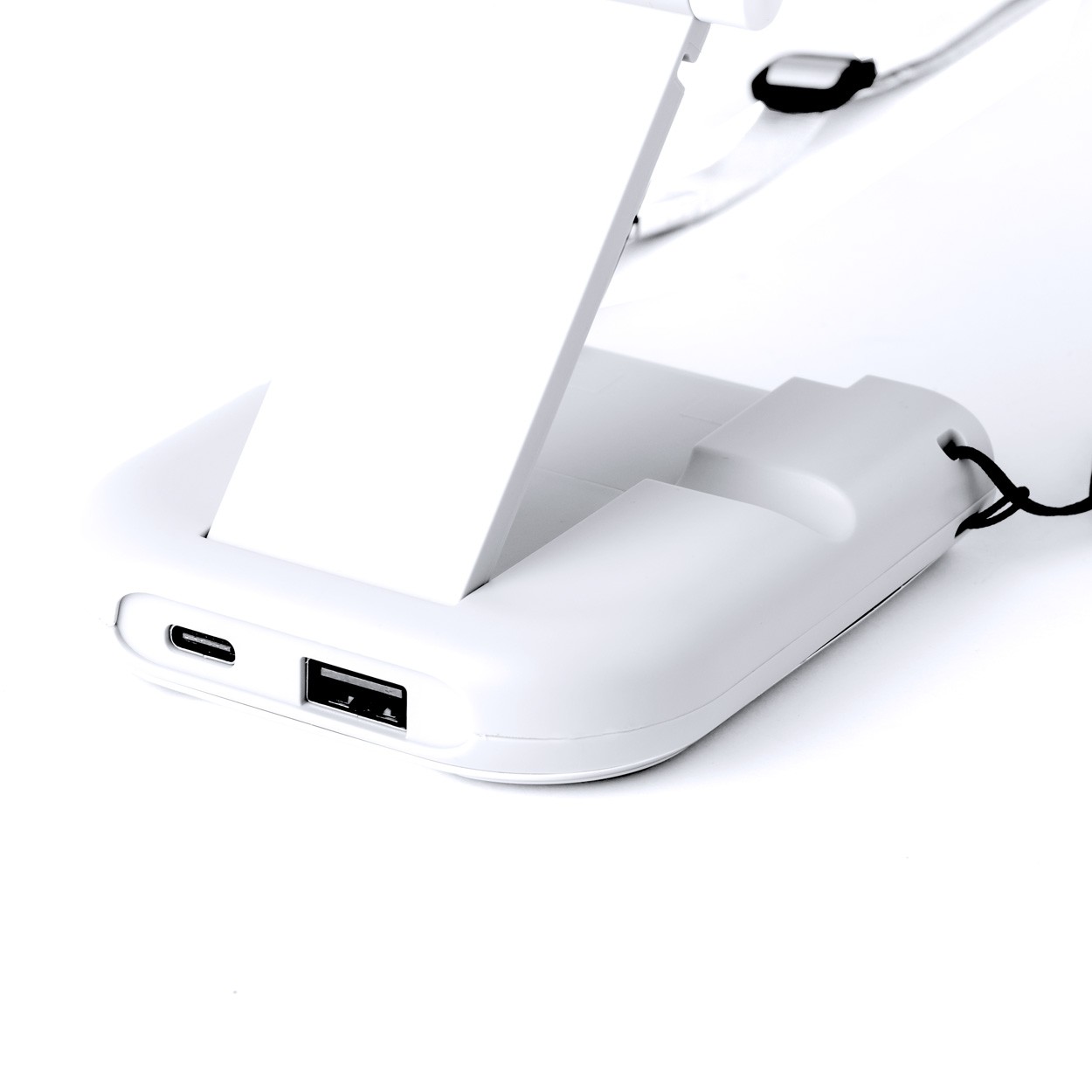 Ventilator electric pliabil, din plastic ABS, cu 3 moduri, suport telefon mobil și șnur. Inclusiv cablu de încărcare micro USB.