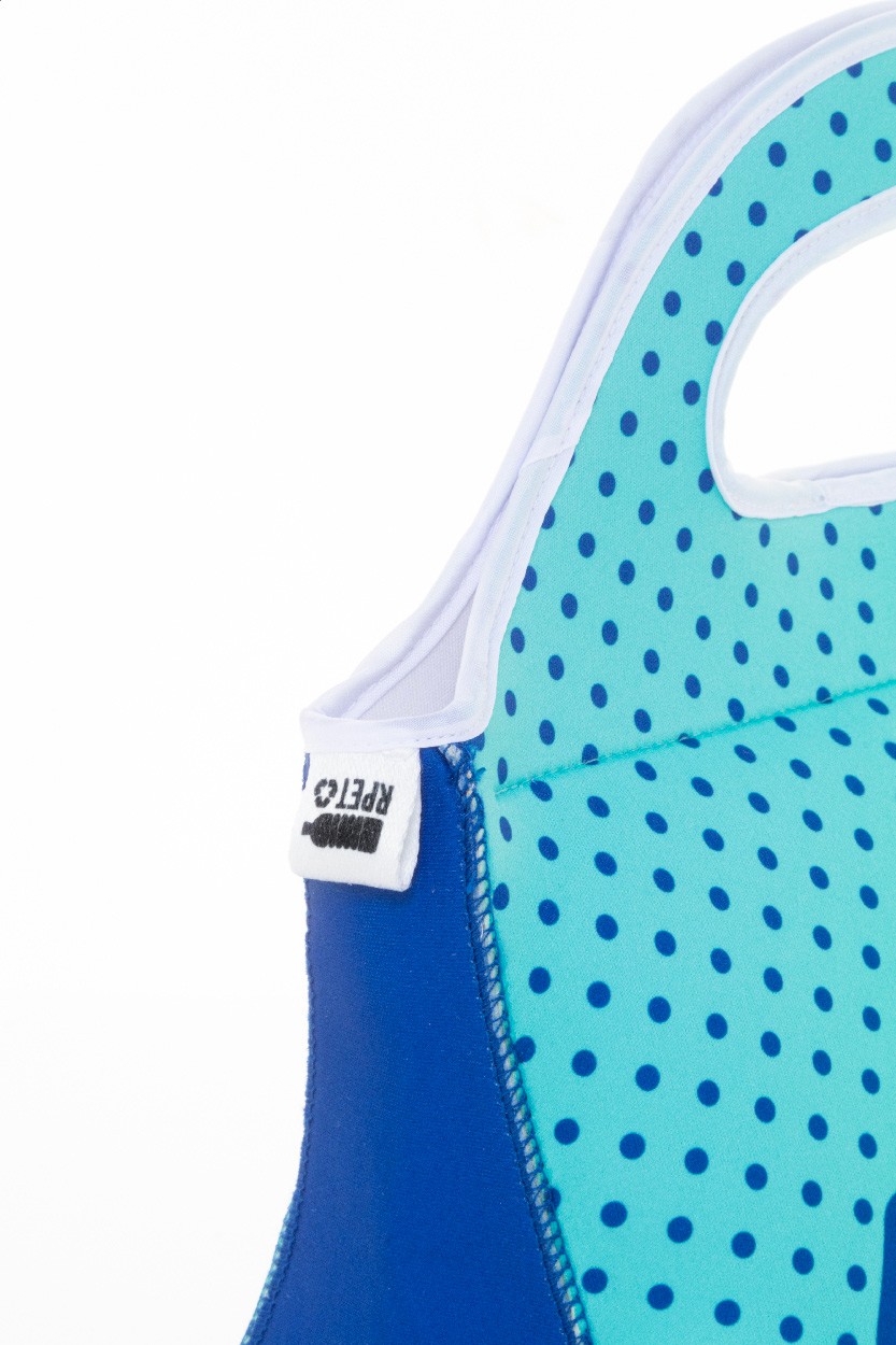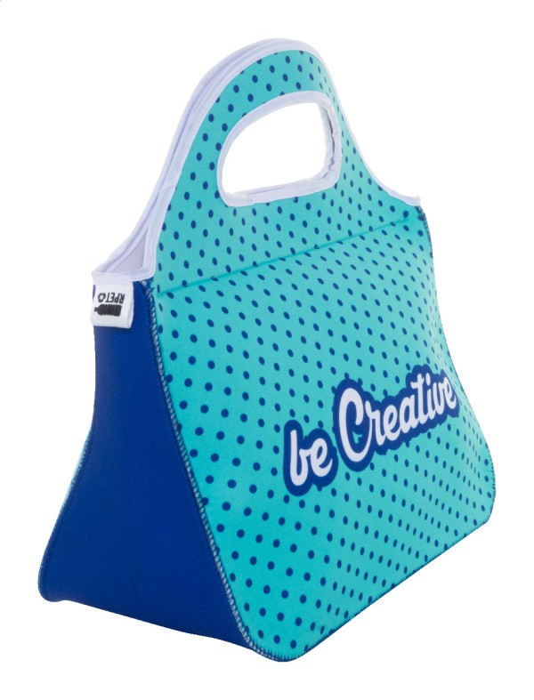 Geantă pentru prânz din neopren RPET, realizată la comandă, cu compartiment și mânere cu fermoar. Grafică imprimată prin sublimare pe toată suprafața și etichetă distinctivă din RPET. MOQ: 25 buc.