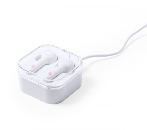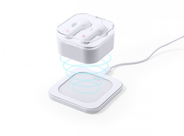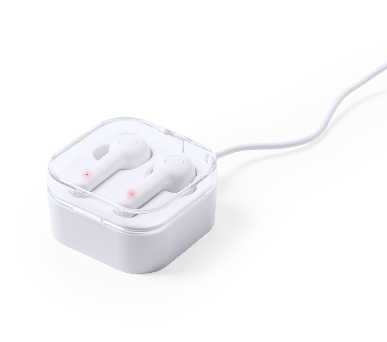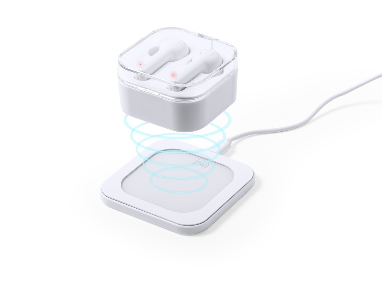 Căști bluetooth wireless cu funcție de apelare hands-free, în carcasă de încărcare din plastic, care pot fi încărcate wireless. Inclusiv baza încărcătorului wireless (ieșire max.: 1000 mA) cu cablu de încărcare USB.
