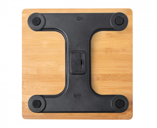 Cântar digital de baie, cu platforma de cântărire din bambus și funcție de termometru. Capacitate: 180 kg, gradare 0,05 kg, unități de măsură: kg/lb. Functioneaza cu 2 baterii AAA, fără baterie.