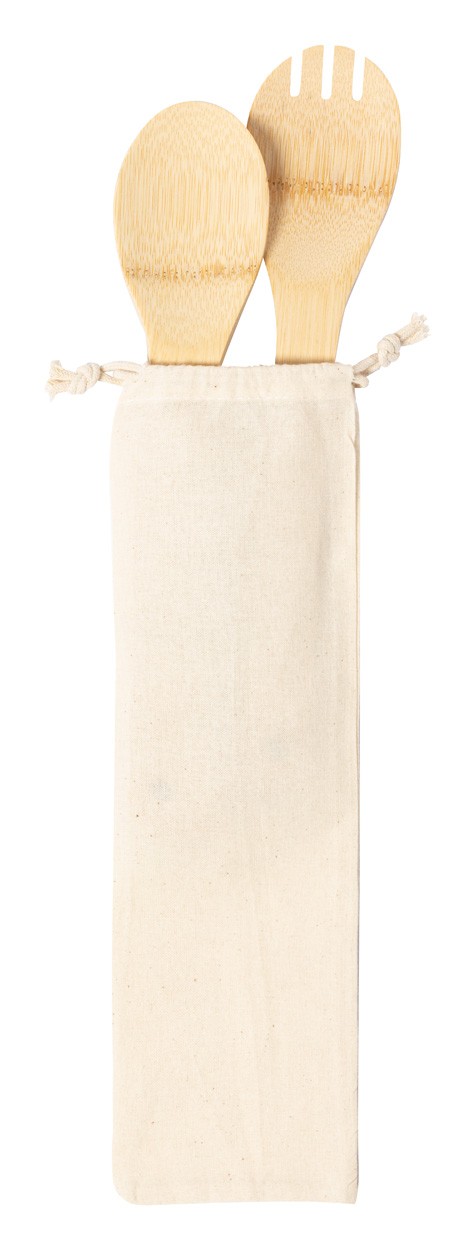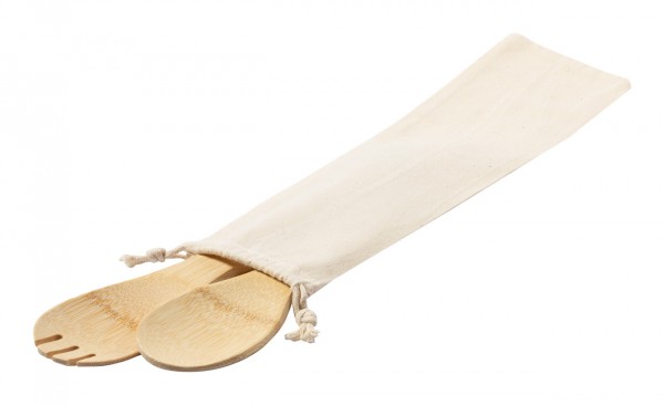 Set de 2 bucăți de tacâmuri de servire pentru salată, din bambus, în pungă de bumbac cu șnur.