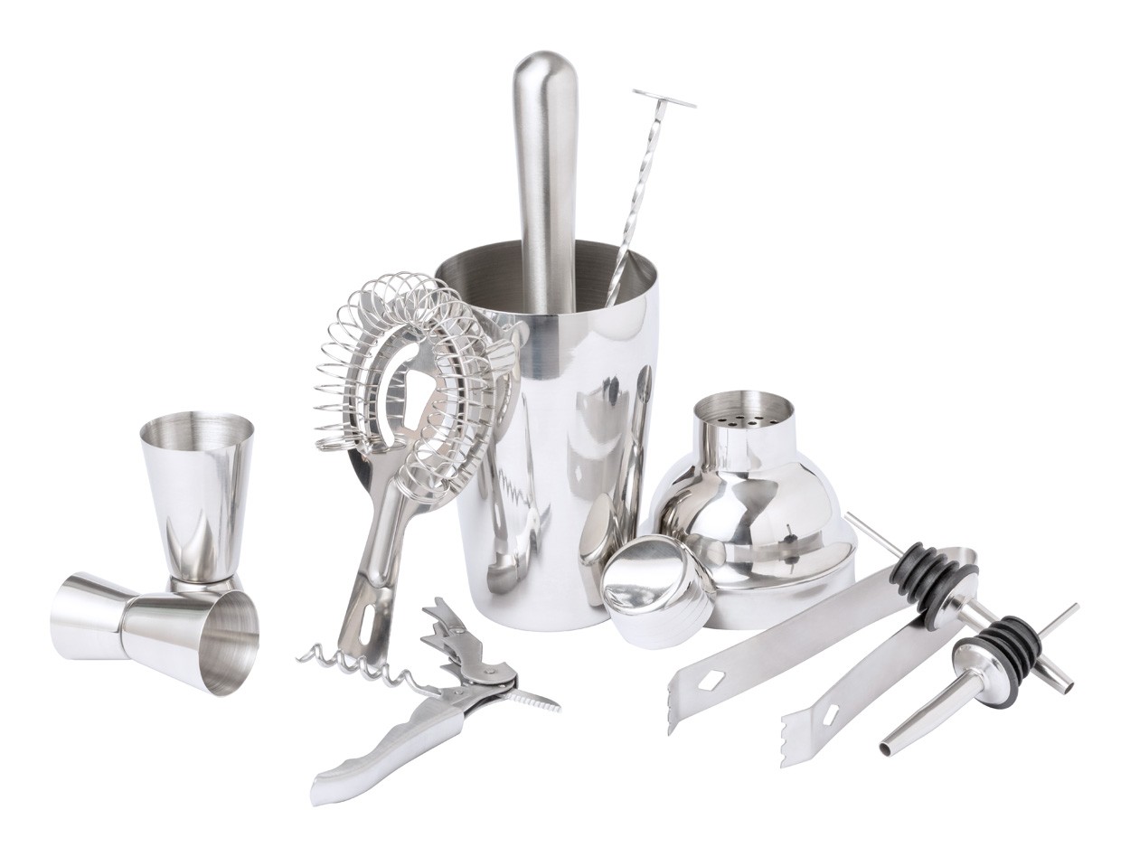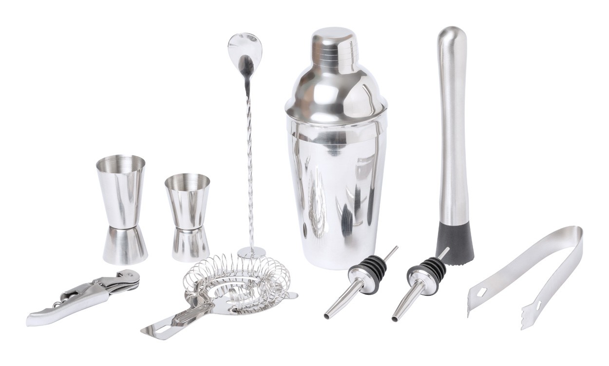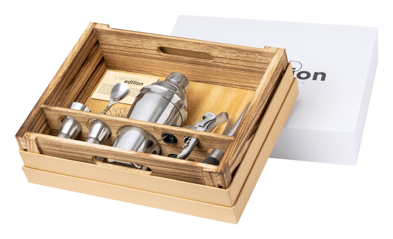 Set de cocktail, elegant, din oțel inoxidabil, în cutie de lemn. Include: 1 agitator, 1 mortar, 2 cești de măsurare, 1 clește pentru gheață, 1 filtru, 1 tirbușon, 1 lingură de amestecare și 2 capace de dozare. Produs Limited Edition.