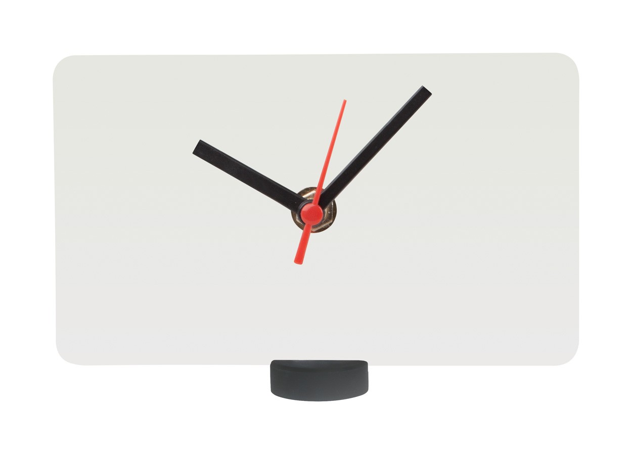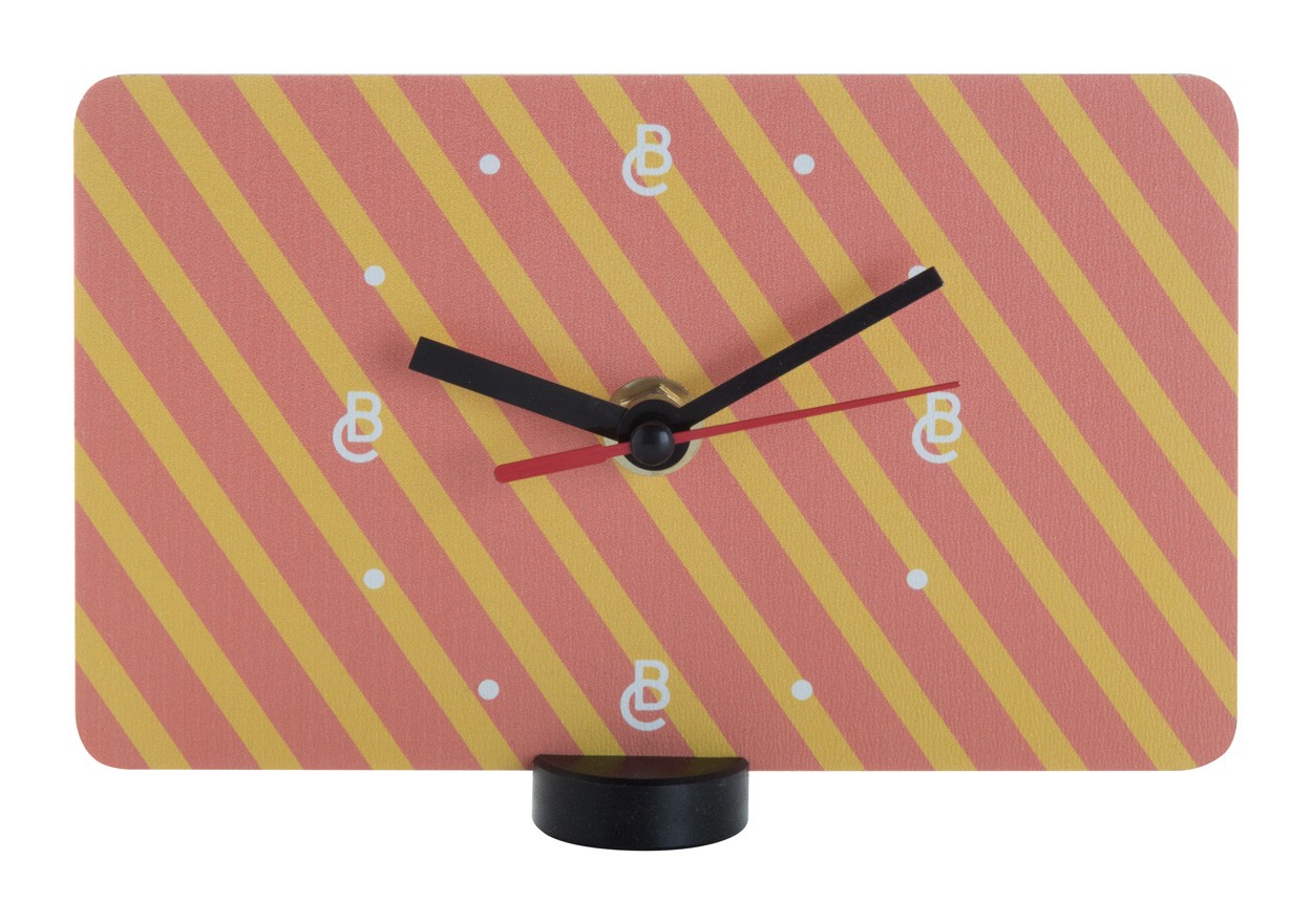 Ceas de birou cu design unic, din placaj HDF, suport din plastic. Funcţionează cu 1 baterie AA. Se livrează fără baterii. MOQ: 50 buc.