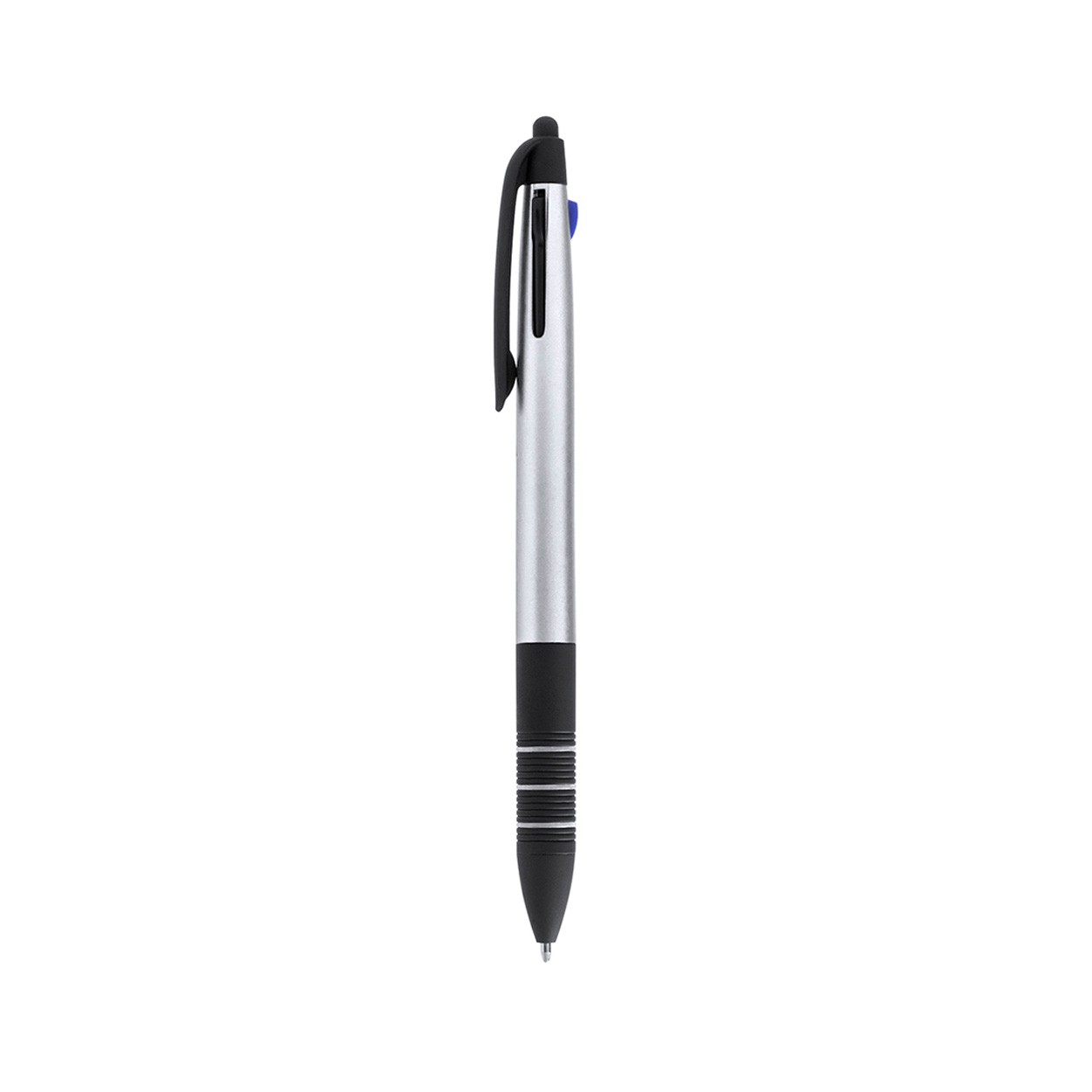Pix din plastic cu stylus touch screen, cu dispozitiv de prindere cauciucat, finisaj mat metalic. Mină albastră, neagră și roșie.