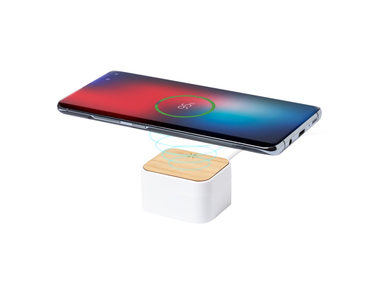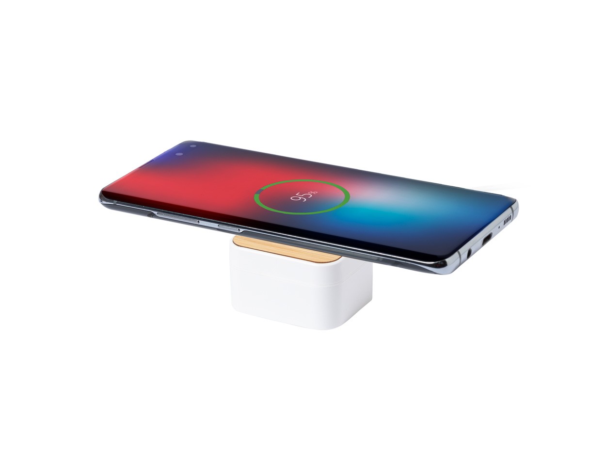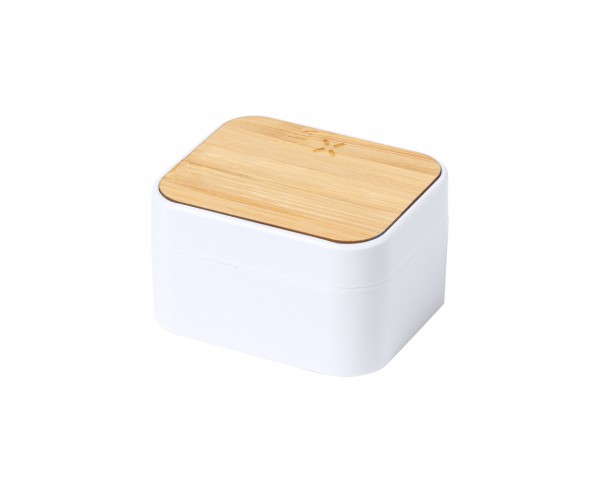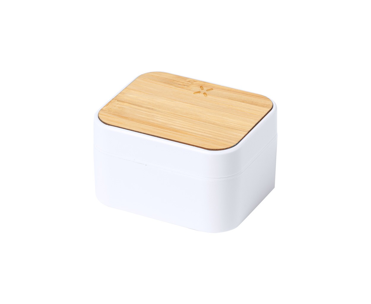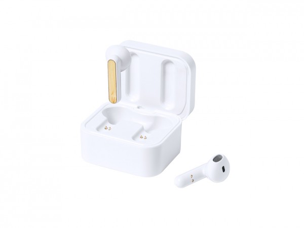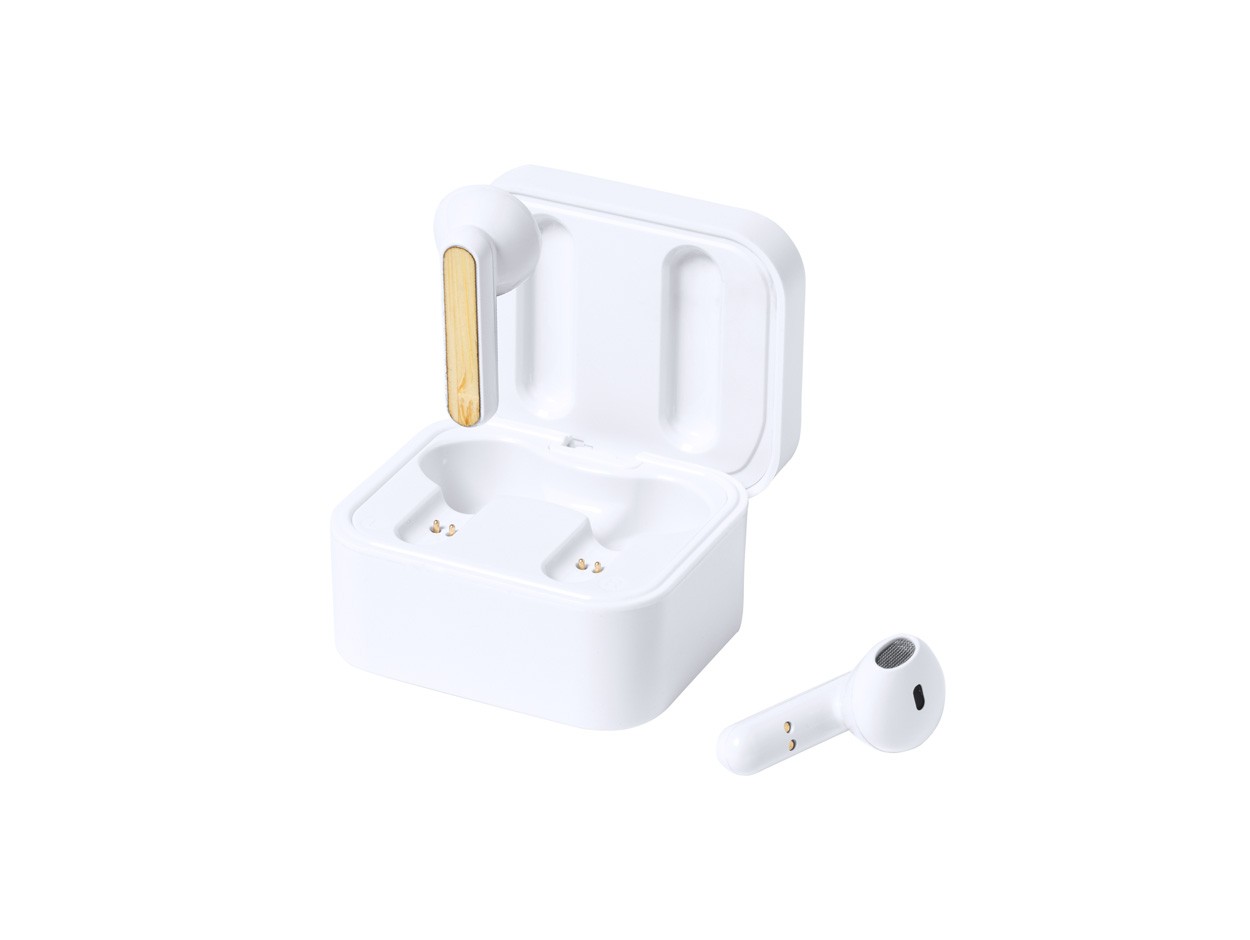 Căști bluetooth, fără fir, cu incrustație de bambus și funcție de apel hands-free. În carcasă de încărcare din plastic ABS cu incrustație de bambus. Inclusiv cablu de încărcare USB.