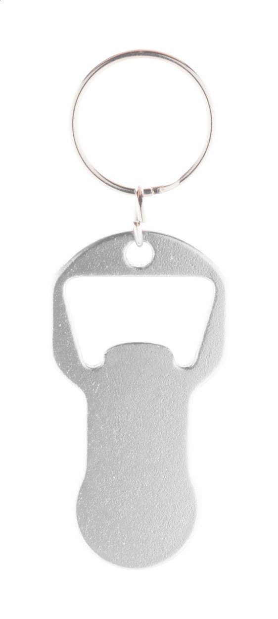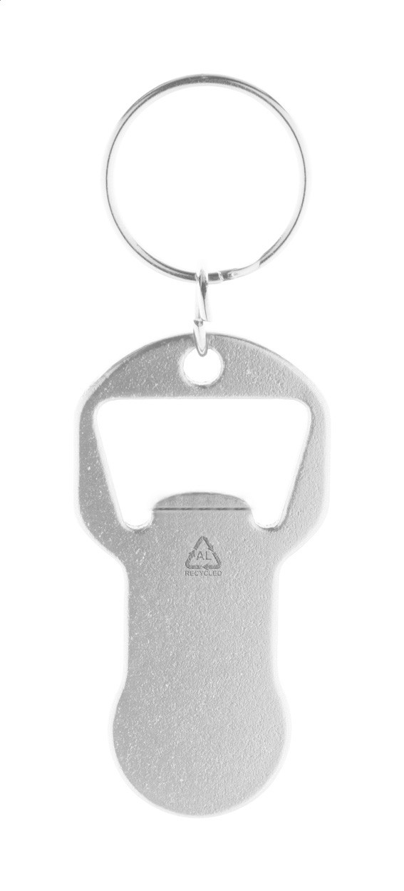 Breloc cu deschizător de sticle, din aluminiu reciclat, cu monedă de cărucior pentru cumpărături.