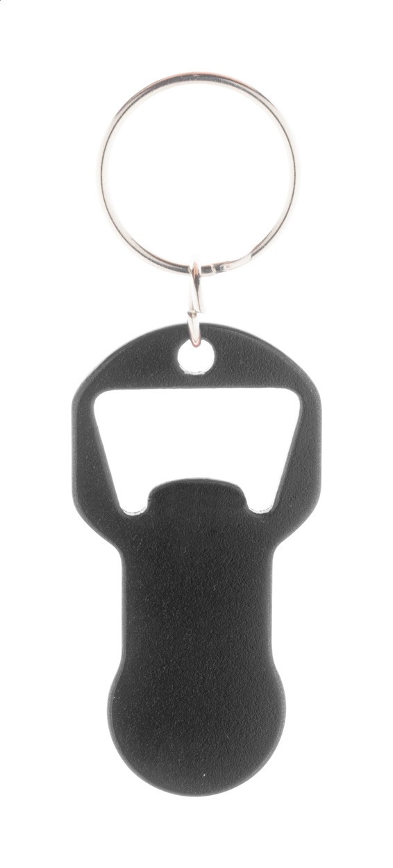 Breloc cu deschizător de sticle, din aluminiu reciclat, cu monedă de cărucior pentru cumpărături.