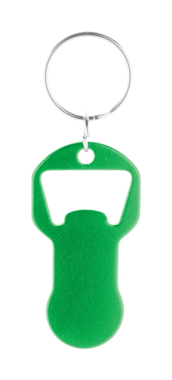Breloc cu deschizător de sticle, din aluminiu reciclat, cu monedă de cărucior pentru cumpărături.