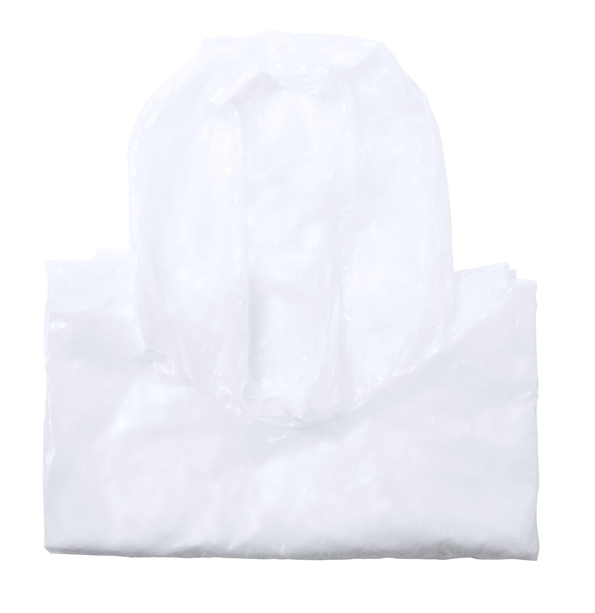 Pelerină de ploaie transparentă, mărime universală pentru adulți, în suport din plastic colorat cu carabină. Dimensiune: 102 × 127 cm.