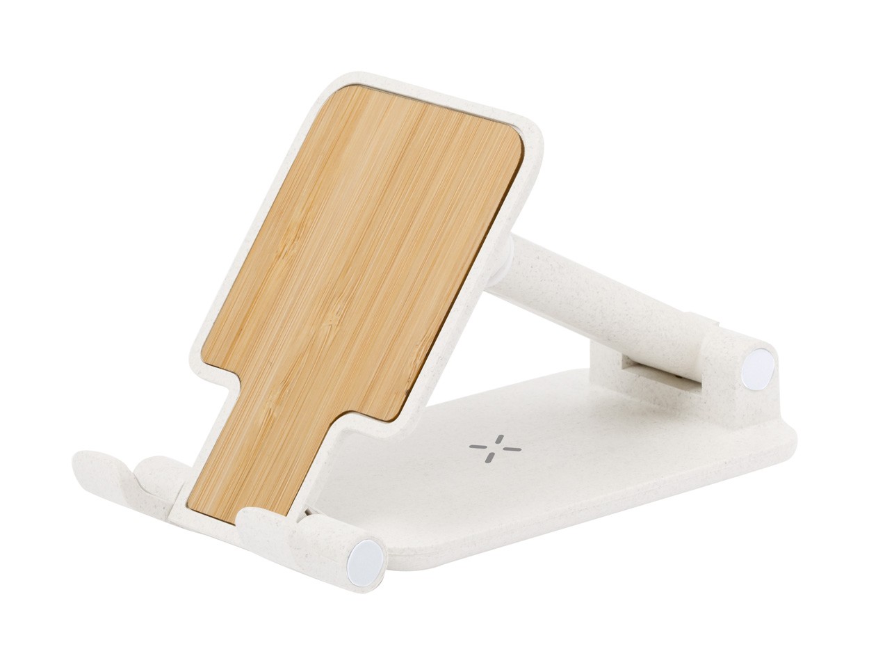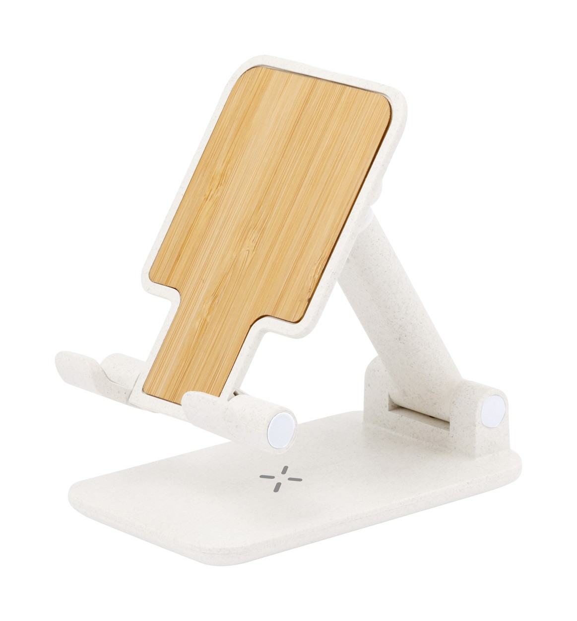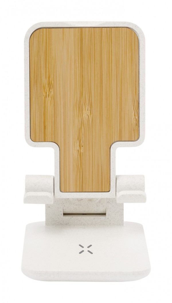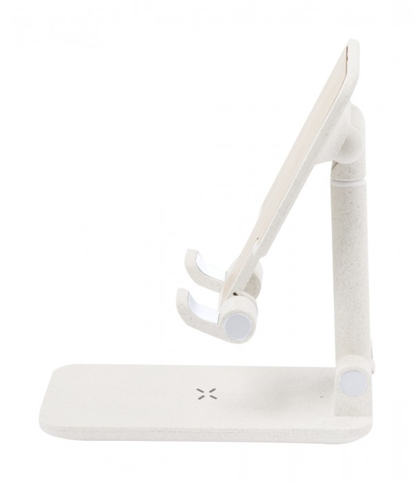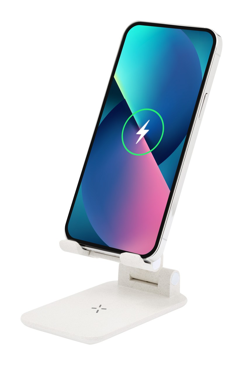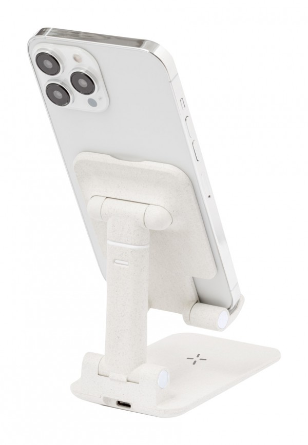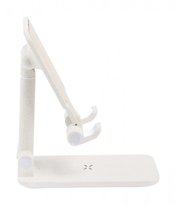 Suport telefon mobil de birou, pliabil, reglabil, din plastic din paie ecologice de grâu și bambus, cu încărcător rapid wireless încorporat (15W). Inclusiv cablu de încărcare USB.