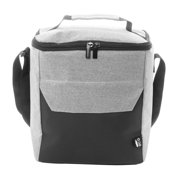 Geantă frigorifică cu fermoar, din RPET, cu detalii acoperite cu PU și căptușeală PEVA. Cu mâner, curea de umăr reglabilă și buzunar mic din față. Poliester 600D RPET cu etichetă distinctivă RPET.