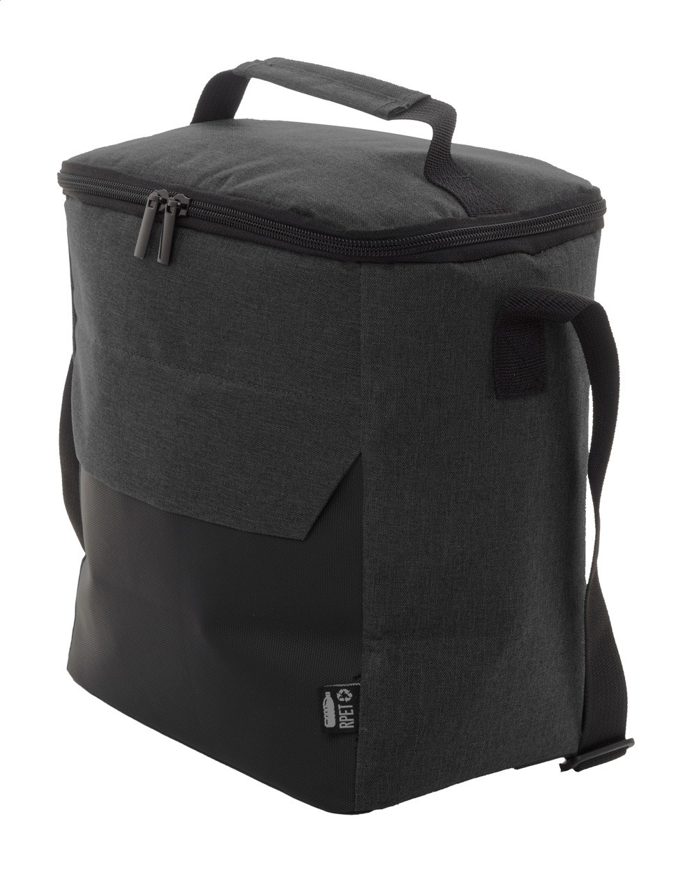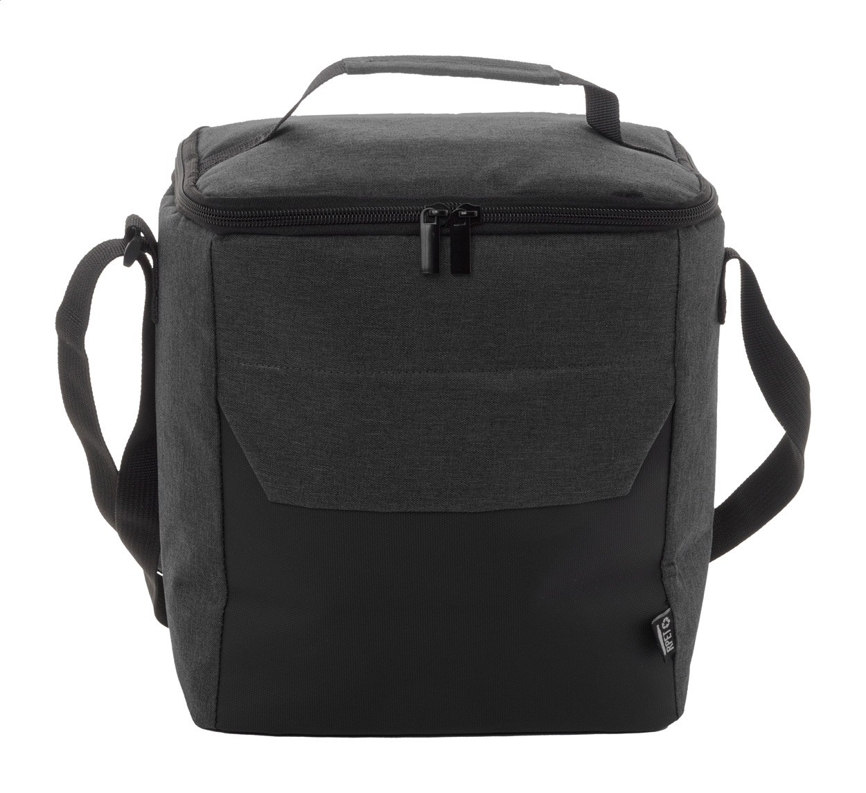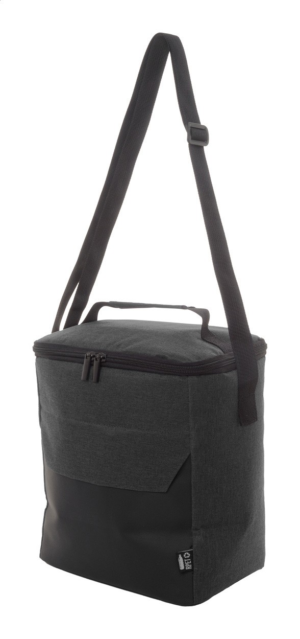 Geantă frigorifică cu fermoar, din RPET, cu detalii acoperite cu PU și căptușeală PEVA. Cu mâner, curea de umăr reglabilă și buzunar mic din față. Poliester 600D RPET cu etichetă distinctivă RPET.