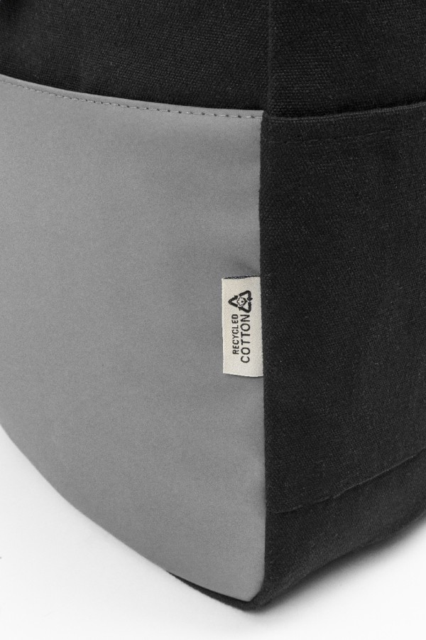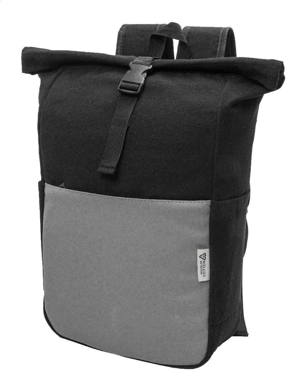 Rucsac roll-top din pânză reciclată, cu închidere cu cataramă și buzunar frontal cu fermoar, din piele PU reciclată moale. Cu compartiment căptușit pentru laptop (15"), buzunare laterale, spate și bretele de umăr căptușite. 70% bumbac reciclat și 30% poliester RPET. Cu etichetă distinctivă din bumbac reciclat.