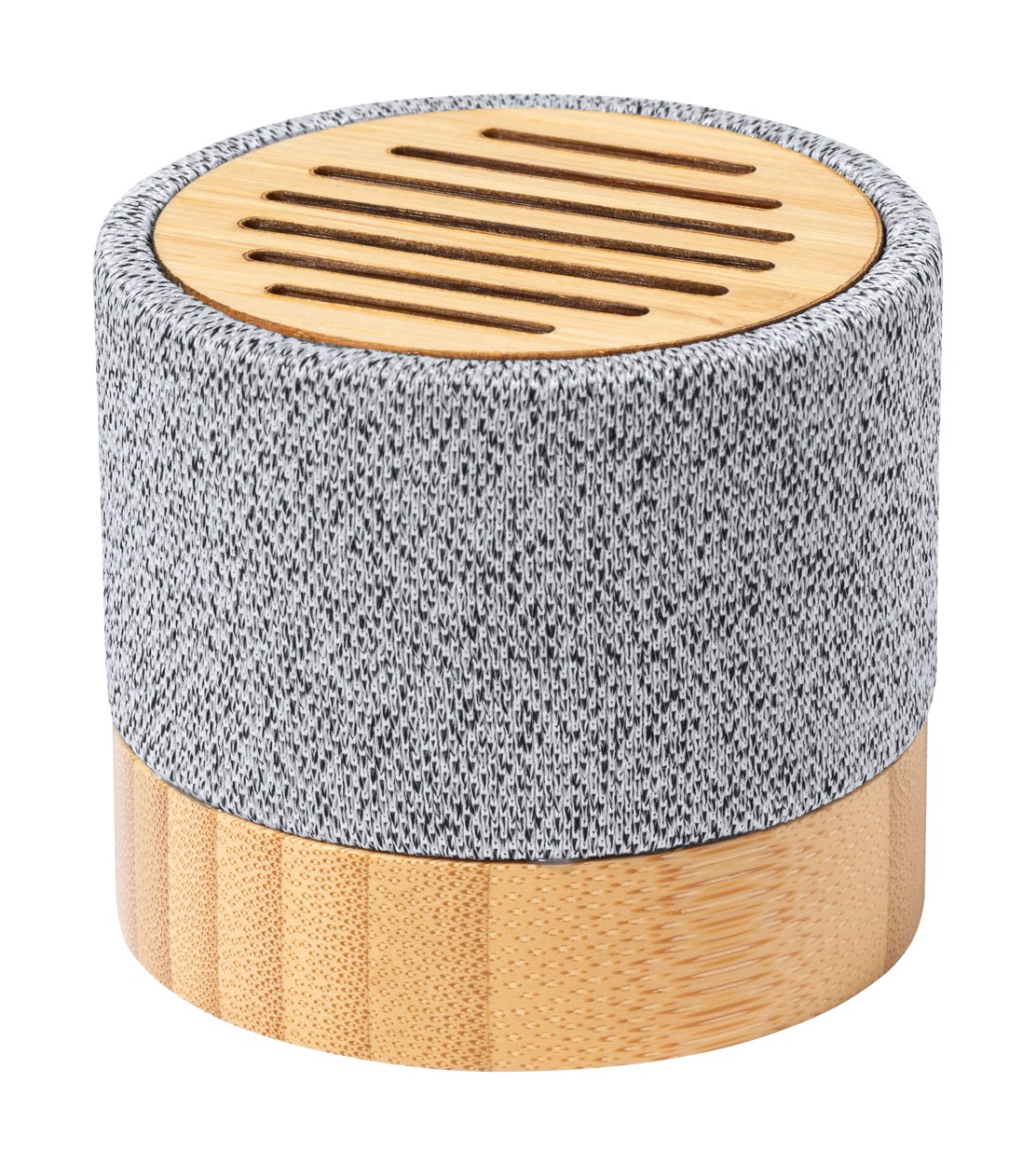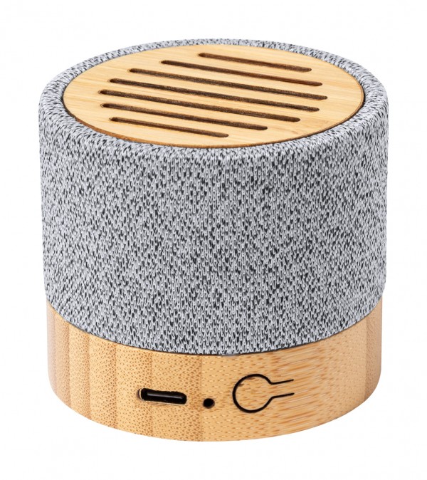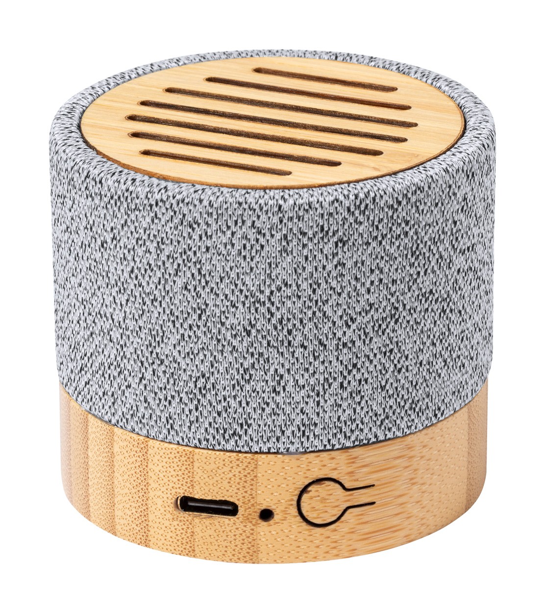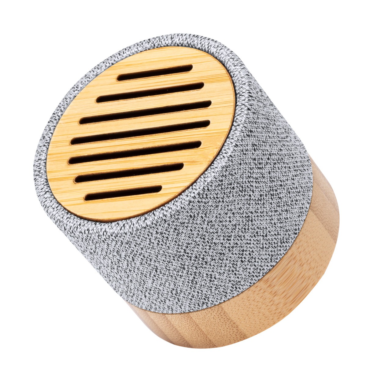 Difuzor Bluetooth, în carcasă din bambus, acoperită cu material poliester RPET, cu baterie reîncărcabilă încorporată. Inclusiv cablu de încărcare USB.