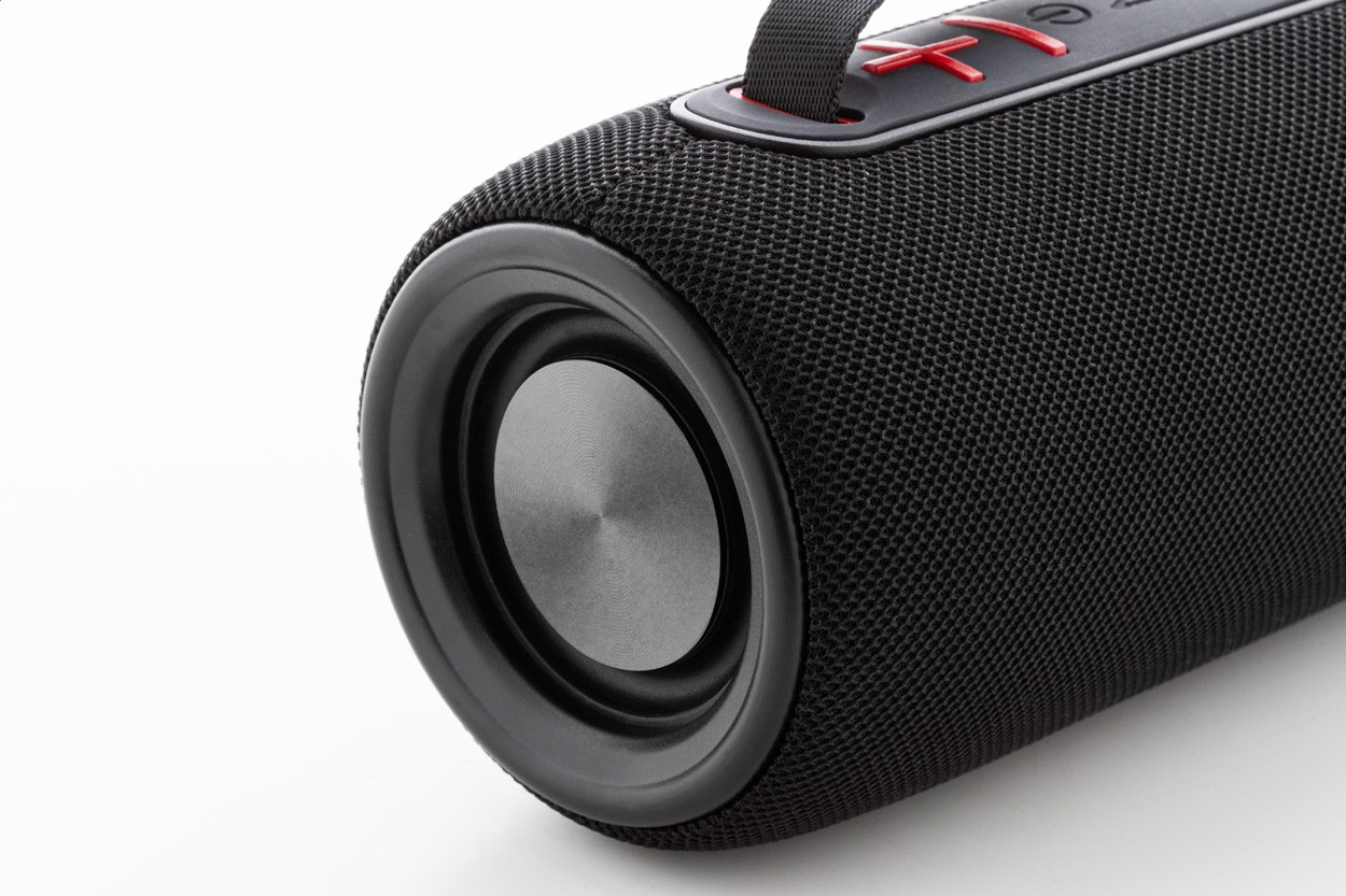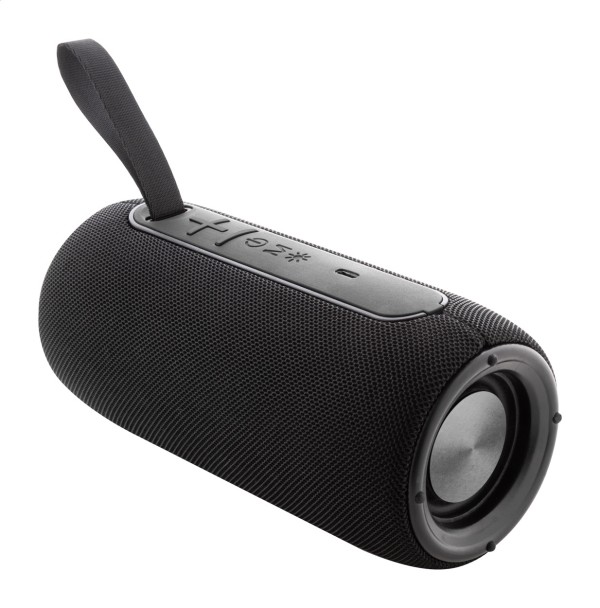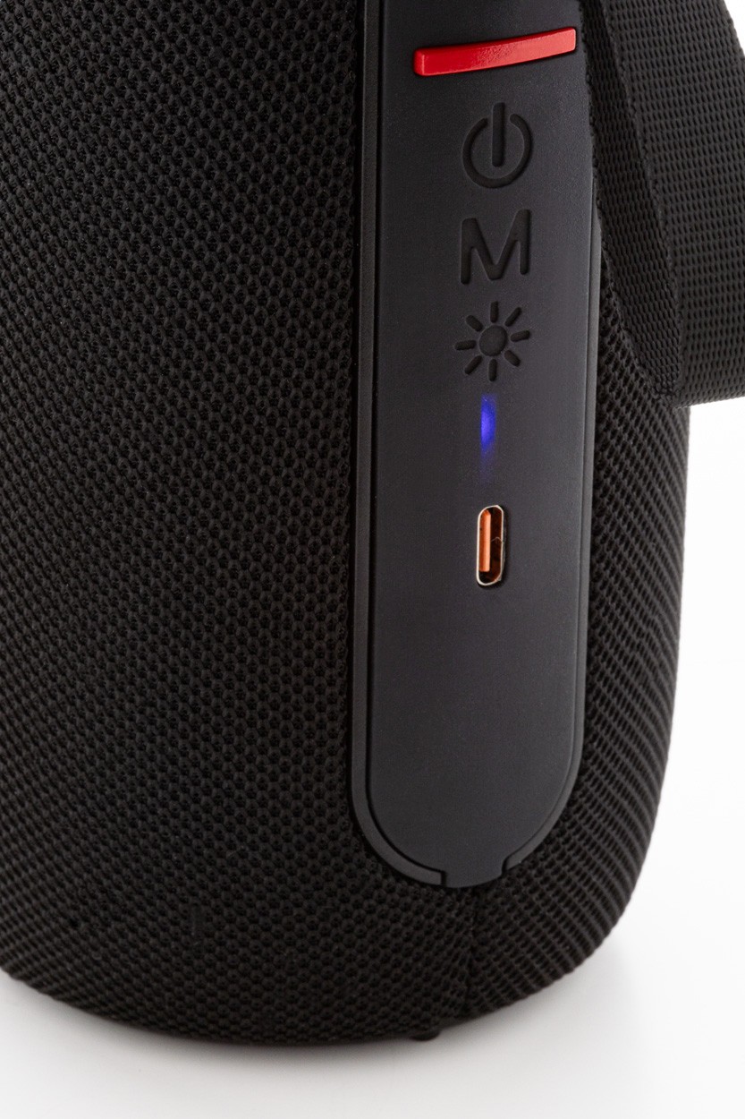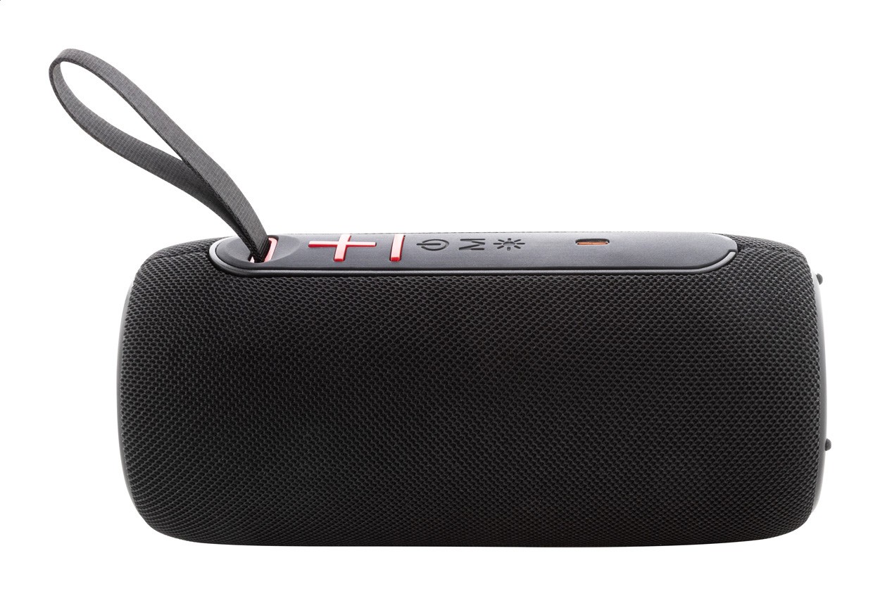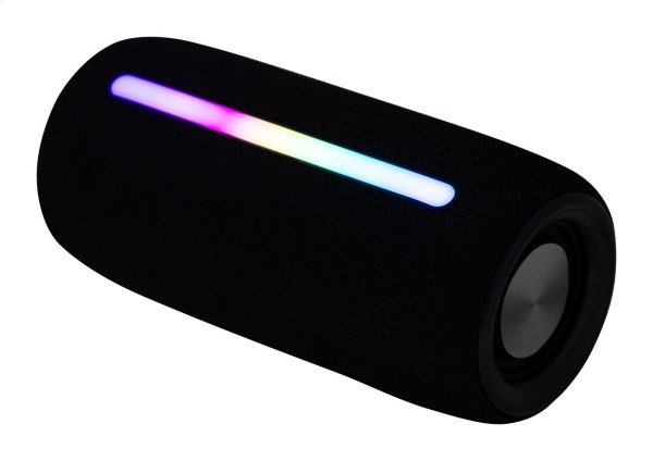 Difuzor wireless acoperit cu țesătură din poliester, cu lumină LED multicoloră și curea de transport. Cu 2 drivere pentru difuzor, funcție de apelare mâini libere și baterie reîncărcabilă încorporată (1200 mAh). Inclusiv cablu de încărcare USB.